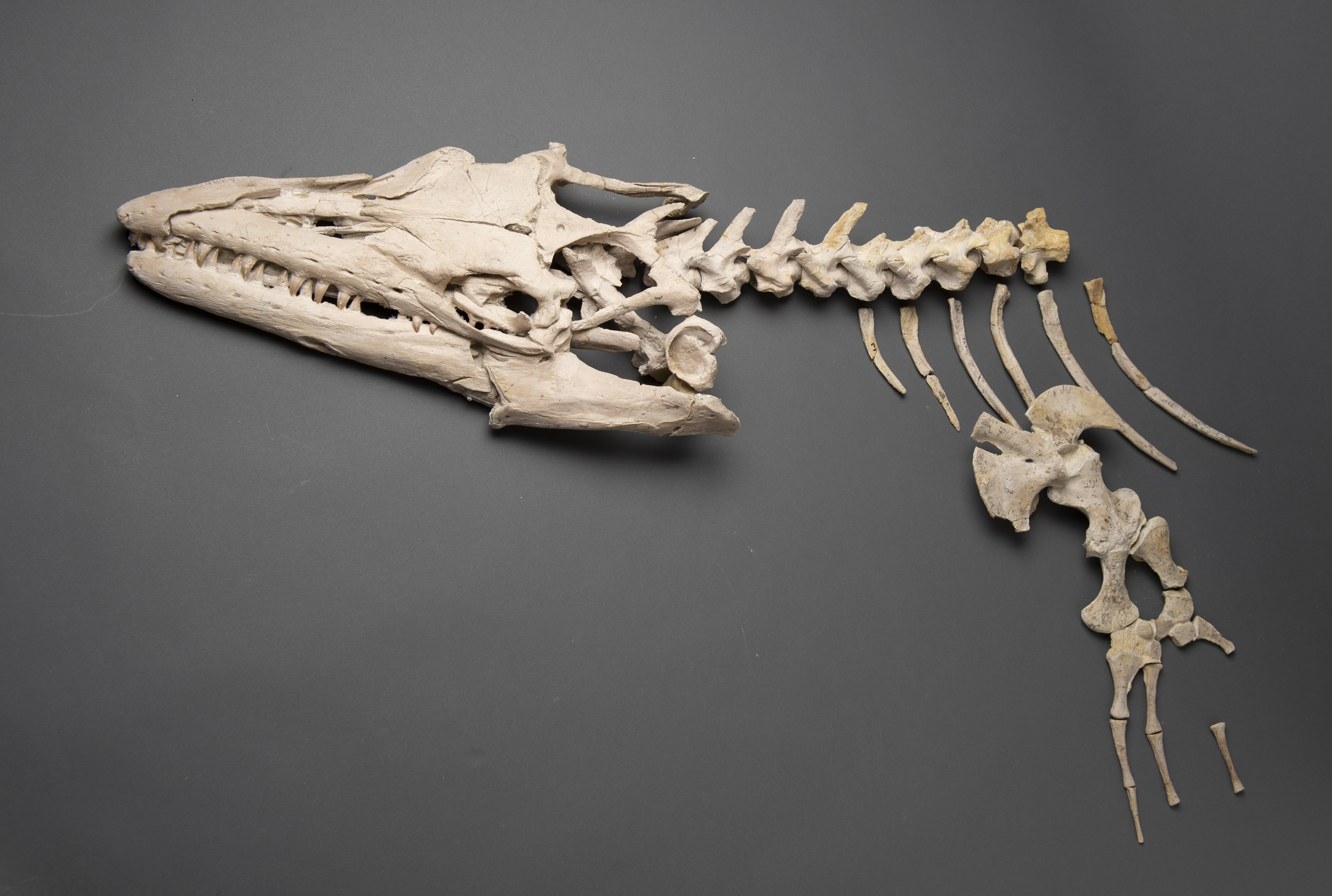 A fossil mosasaur skull and partial skeleton excavated from Angola’s costal cliffs for display in “Sea Monsters Unearthed.”