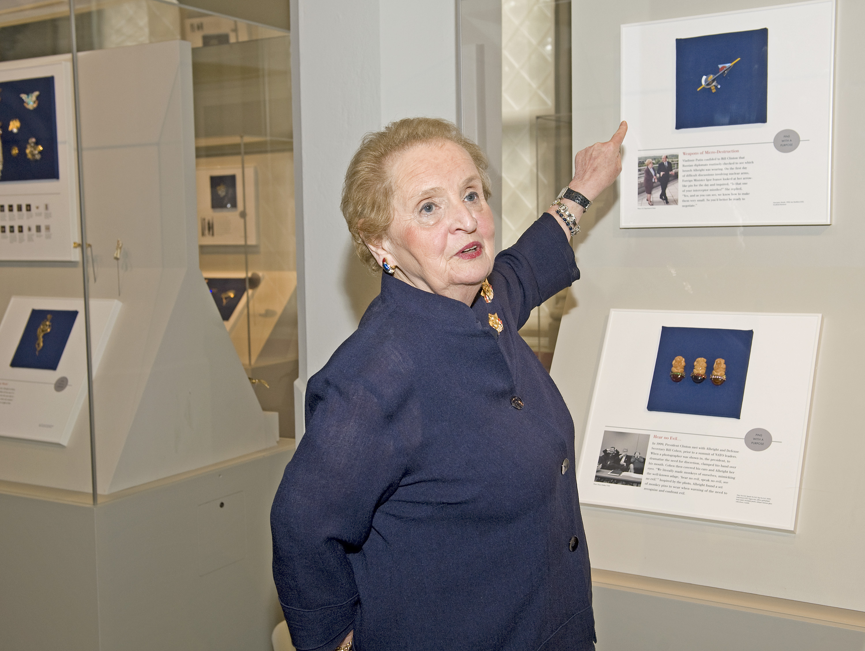 Former U.S. Secretary of State Madeleine Albright gives journalists a preview of “Read My Pins: The Madeleine Albright Collection” on June 15, 2010, at the Smithsonian Institution. The exhibition features more than 200 pins, many of which Secretary Albright wore to communicate messages during her diplomatic tenure. The exhibition opens to the public on June 18 and will be on view at the Smithsonian Castle through Oct. 11, 2010.