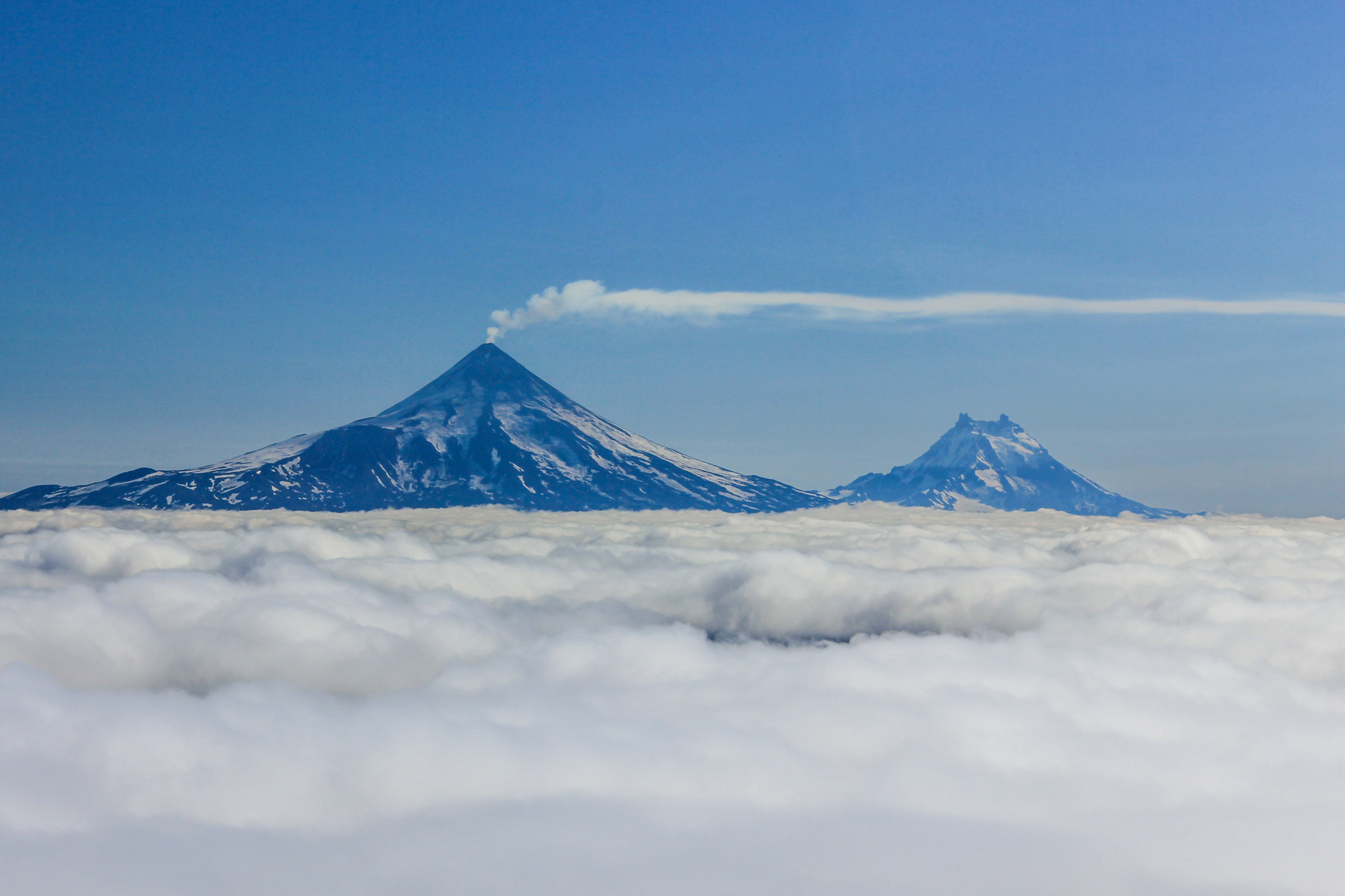Shishaldin Volcano (left) and Isanotski Volcano (right) in 2015. Shishaldin emits a plume of volcanic gas that is carried by the wind. Isanotski may have originally had a form similar to that of Shishaldin, but it has not erupted recently, and it has been whittled away by the erosive power of ice. Shishaldin had large eruptions in 1999, 2004 and 2019, emitting plumes of volcanic ash over 10,000 feet into the air. The photo was captured during a helicopter flight to Shishaldin, where the research team collected rock samples of recent eruptions.