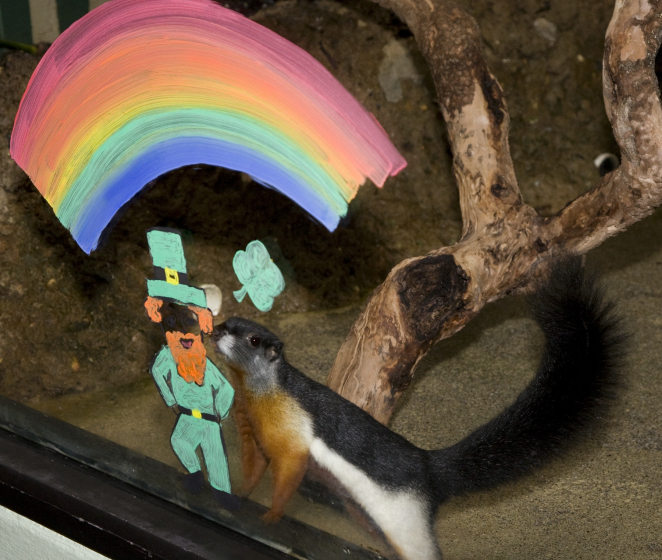 While the animals in the Small Mammal House may not understand the concept of St. Patrick’s Day, they do enjoy enrichment. Many of the animals, such as the Prevost’s squirrel, anxiously watched while their enclosure was decorated and special treats were distributed. For them, there is excitement in novelty, and the Zoo’s keeper staff use holidays as a perfect opportunity to entertain visitors while providing enrichment for the animals. The Prevost’s squirrel investigated the paintings on the outside of his enclosure and played with several novelty items placed inside his exhibit.