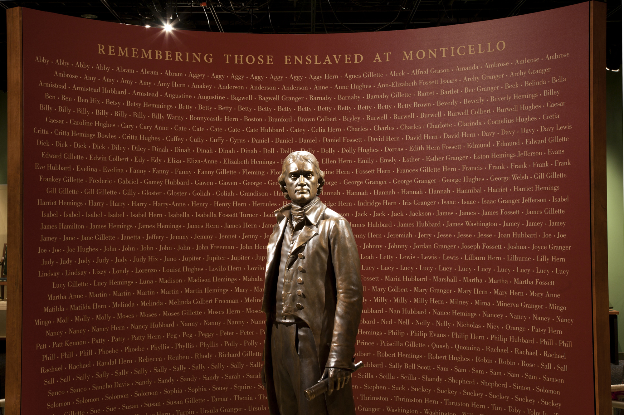 A statue of Thomas Jefferson, standing in front of a wall containing the names of the more than 600 enslaved people he owned, greets visitors to the exhibition "Slavery at Jefferson's Monticello: Paradox of Liberty."
