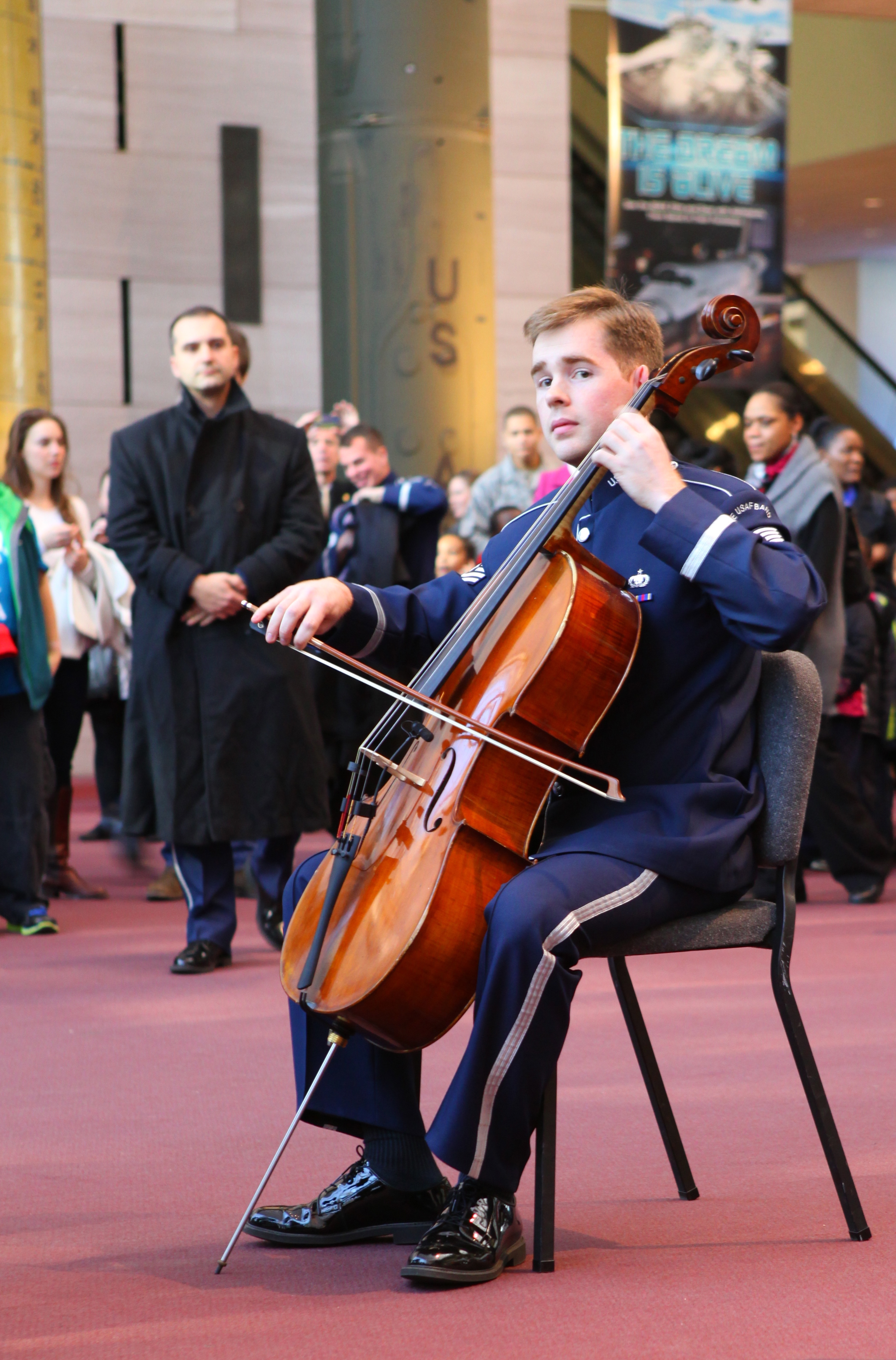 Cellist TSgt Edward Prevost starts the holiday flash mob at the Smithsonian National Air and Space Museum in downtown Washington, D.C. View the video at: www.youtube.com/watch?v=gIoSga7tZPg
