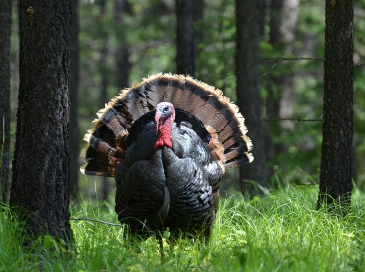 This turkey is of the Merriam’s subspecies, one of six turkey subspecies. All commercial turkey lines descend from the South Mexican turkey subspecies, which is extinct in the wild.