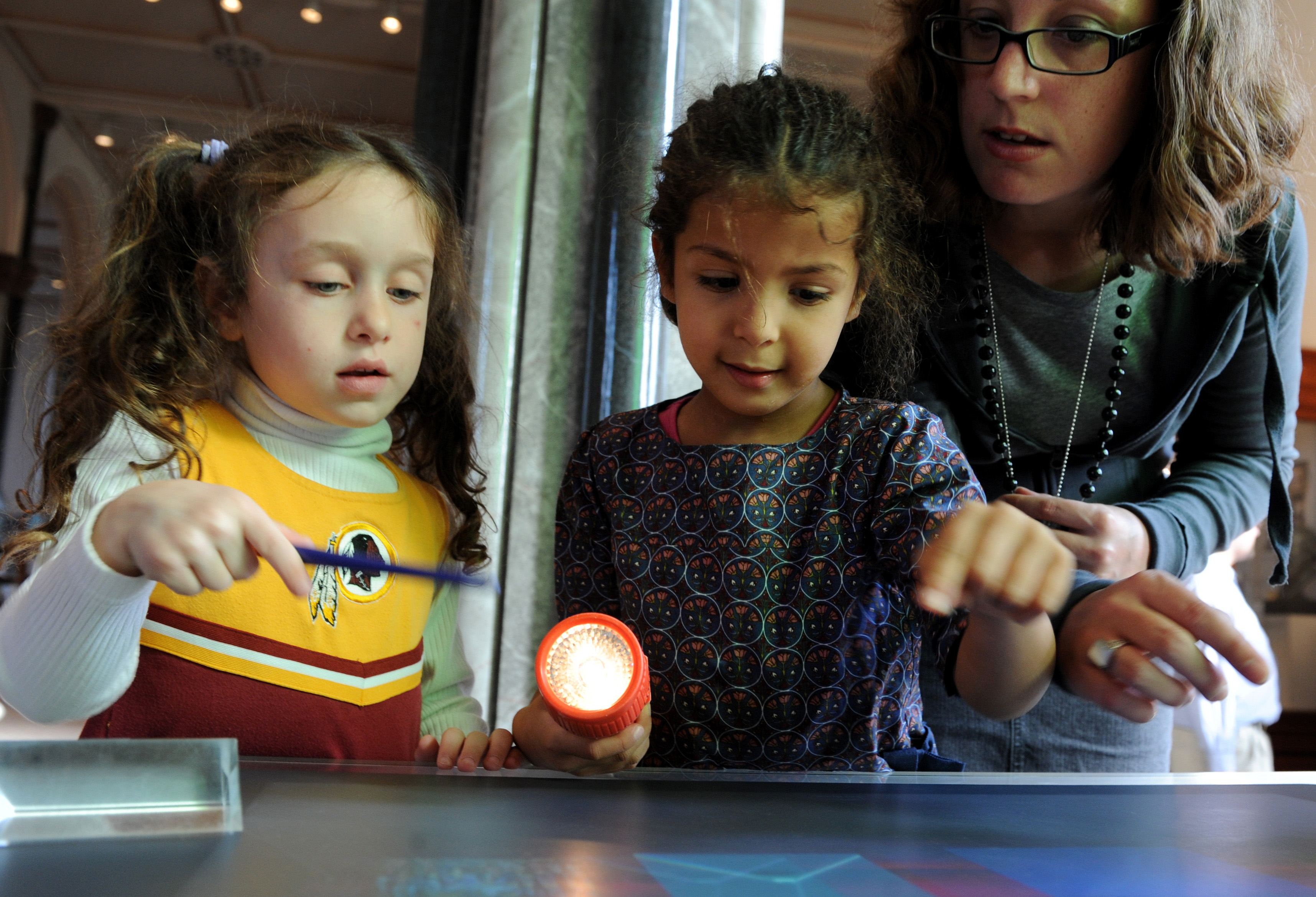 Students from the Smithsonian Early Enrichment Center play with light on a Microsoft Surface, a multitouch display that offers interaction with information and digital content. The Surface unit, which is located in the Great Hall at the Smithsonian's Castle, was donated to the Smithsonian by Microsoft. "The Wonder of Light: Touch and Learn!" exhibit opens on Tuesday, Nov. 9.