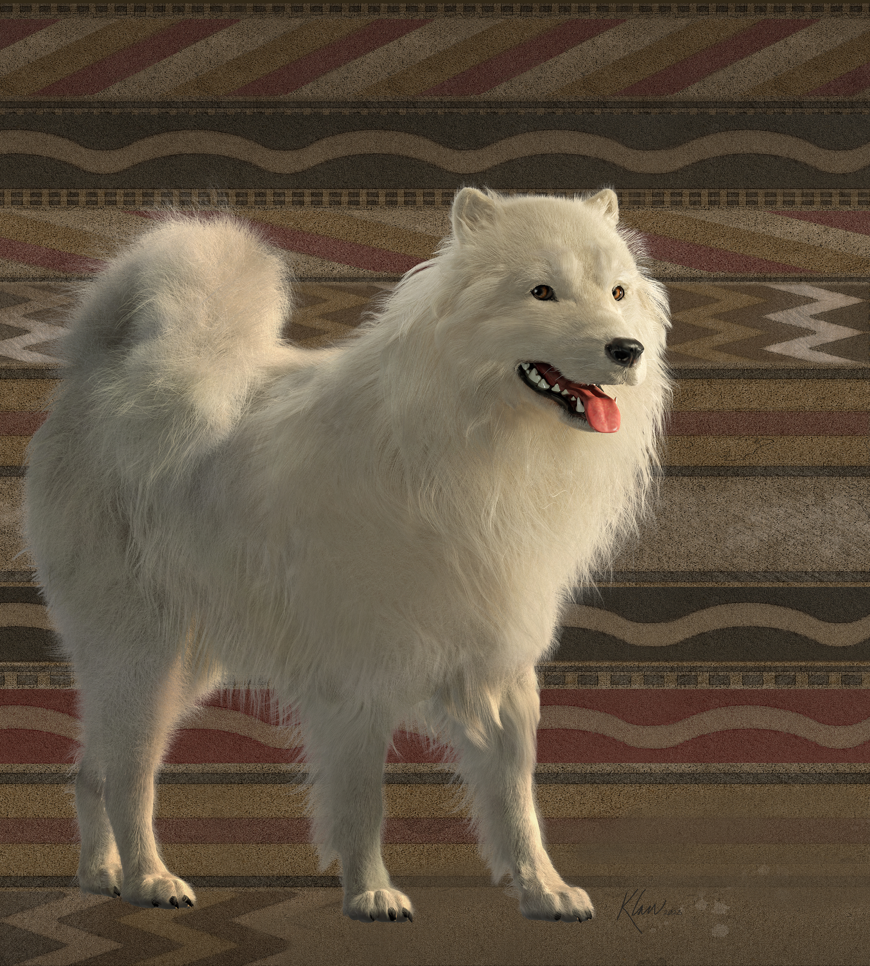 The reconstructed woolly dog stands against a stylized background of a Coast Salish weaving motif from a historic dog-wool blanket. The portrayal of the weaving motif was designed under advisement of the study’s Coast Salish advisory group.