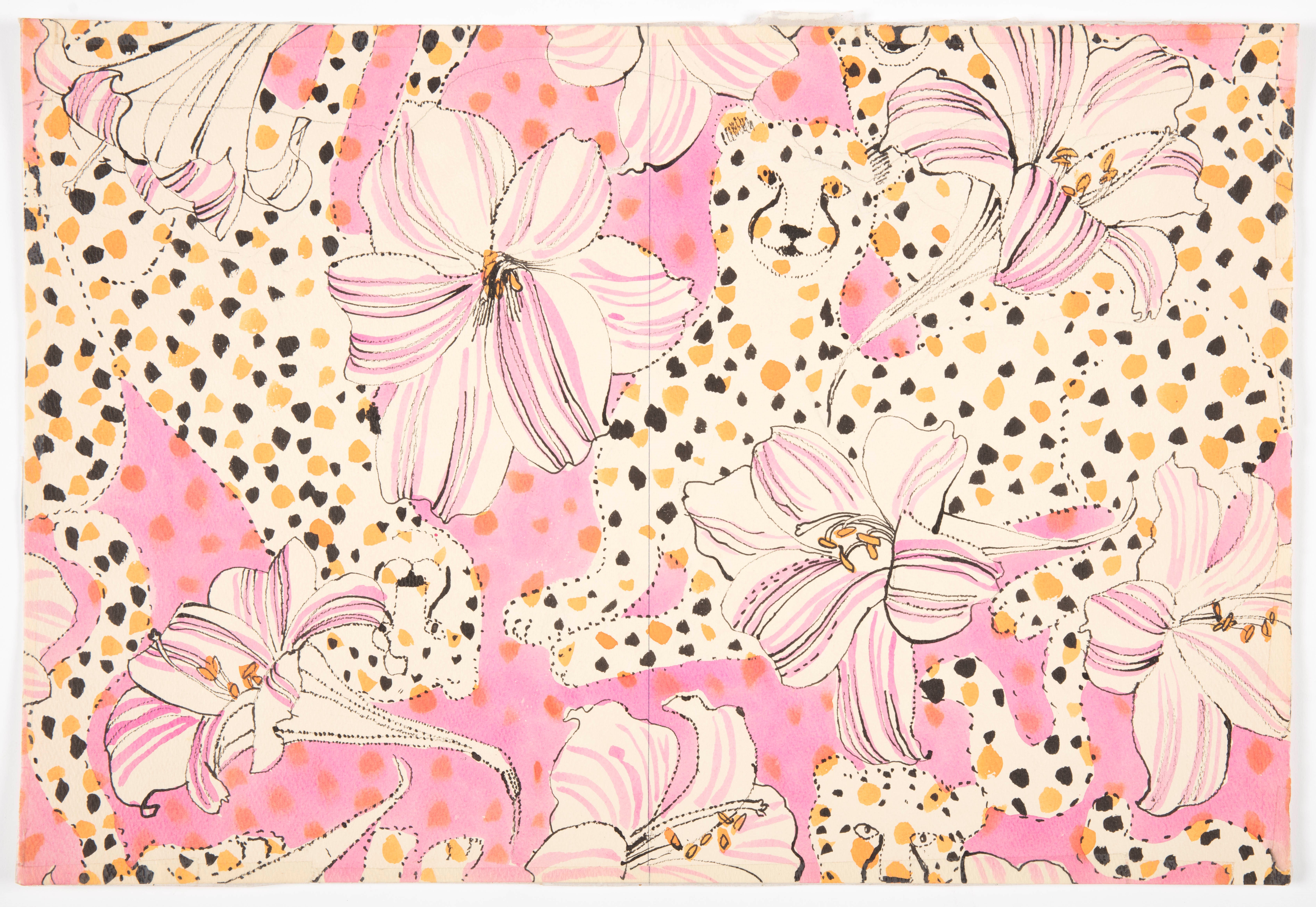 Drawing, Wildness, © September 11, 1972. Designed by Suzie Zuzek (Agnes Helen Zuzek de Poo, American, 1920–2011) for Key West Hand Print Fabrics, Inc. (Key West, Florida). Used by Lilly Pulitzer, Inc., before 1985 (Palm Beach, Florida). Brush and watercolor, pen and black ink, graphite on paper. 38.1 × 56.2 cm (15 × 22 1/8 in.). Cooper Hewitt, Smithsonian Design Museum. Gift of The Original I.P. LLC, 5891.6.2018. Photo: Matt Flynn © Smithsonian Institution.