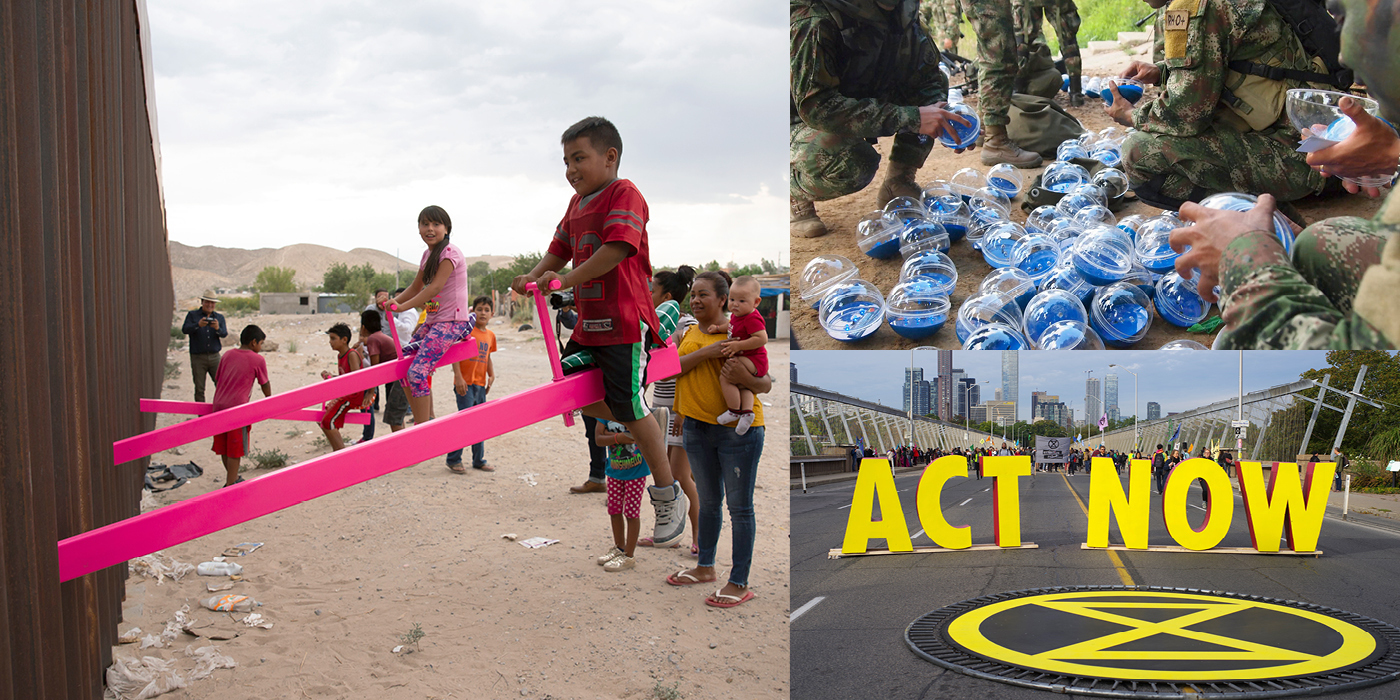 Among the projects on view in this section are Rael San Fratello’s Teeter-Totter Wall, which featured three pink seesaws installed through the slats of the towering steel US-Mexico border wall to echo how movements and actions taken on one side of the border directly impacted the other; Colombia’s Christmas Operations demobilization campaign, which brought floating orbs filled with messages from friends and family to the jungle’s rivers, in an effort to persuade rebels to leave behind their weapons and come home; and the pop-up Social Emergency Response Centers, which bring communities together for mutual aid during social rather than natural emergencies. An interactive installation in the exhibition will invite visitors to consider when they experienced a social emergency in their own lives, how they were affected and what they did to respond.