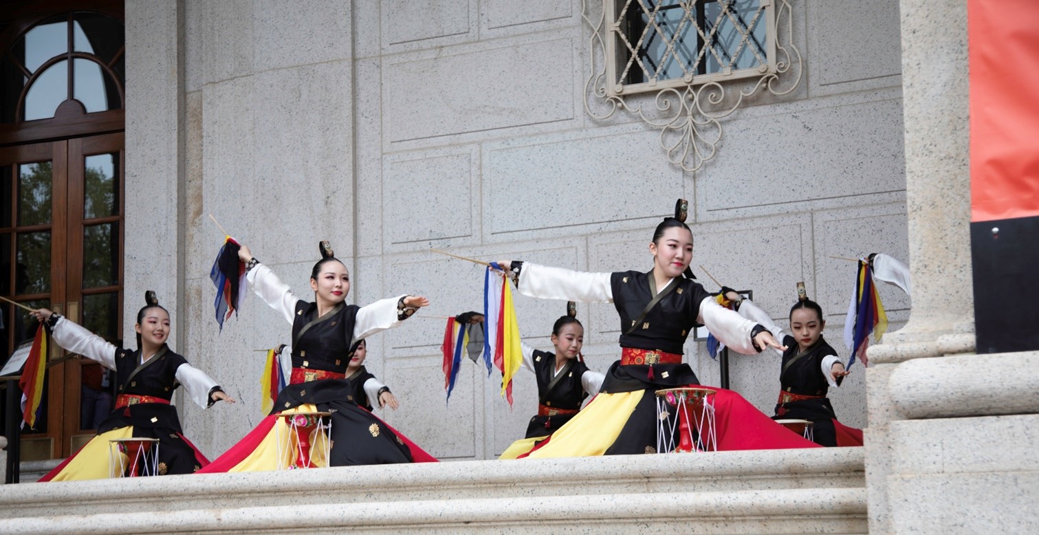 Musical performers synchronously holding their instruments in the air at the museum’s 2023 Chuseok festival. Credit: National Museum of Asian Art, Smithsonian Institution.