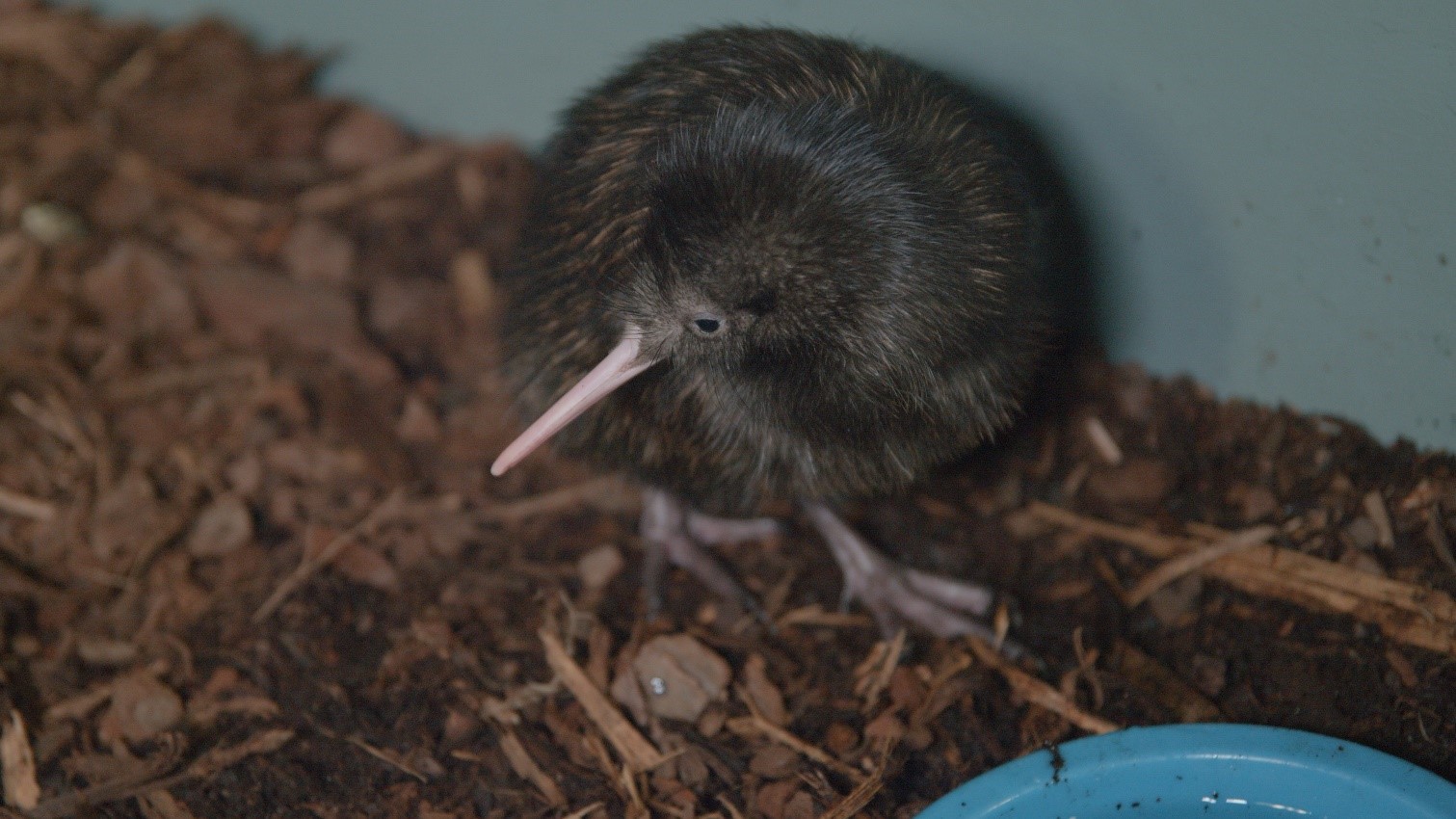 The chick has moved to a brooder box, a special enclosure used to acclimate kiwi chicks before moving them to larger enclosures for adults. She is eating on her own and follows a nocturnal schedule.