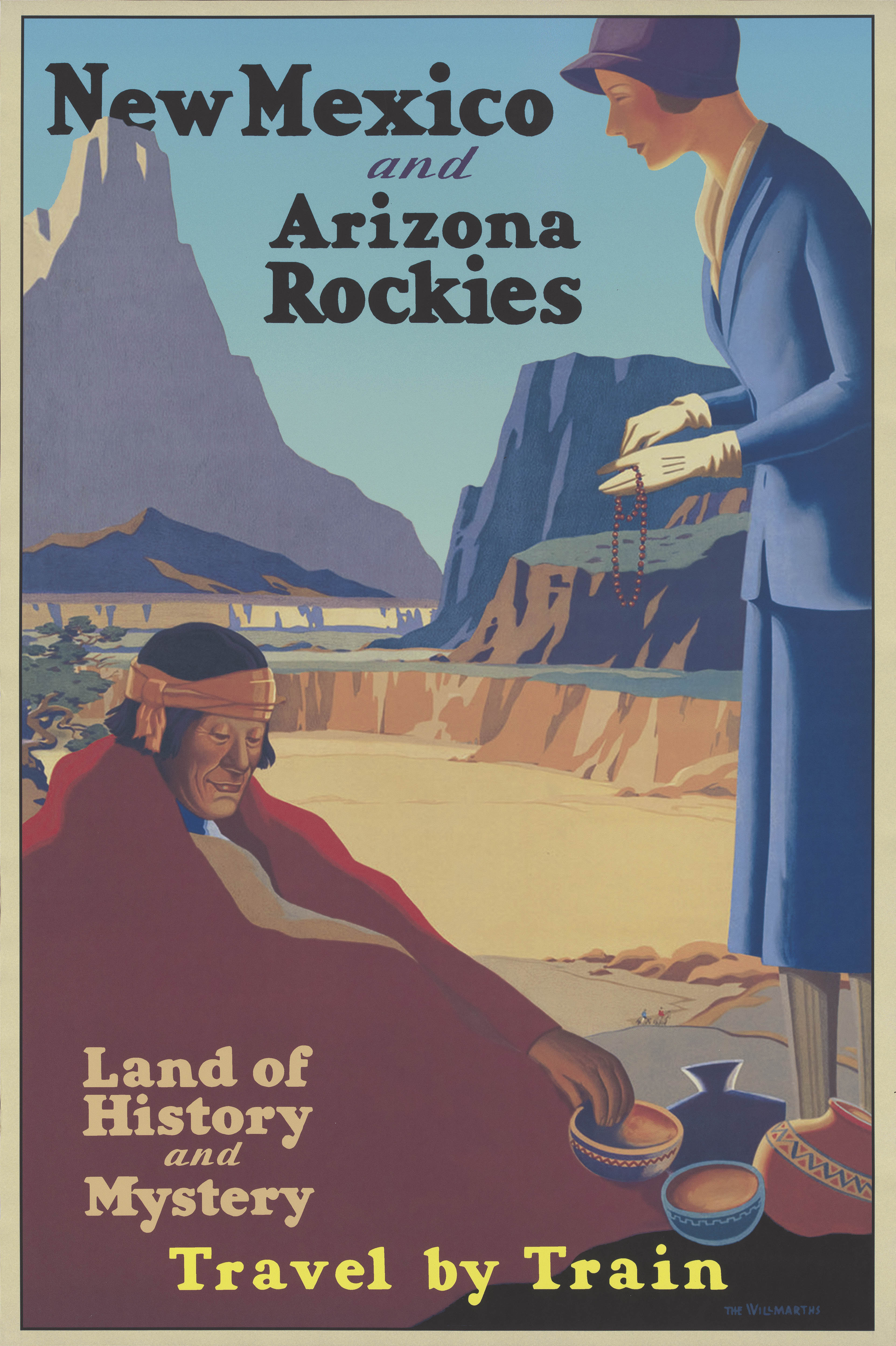 This poster was created to promote the Union Pacific Railroad and to encourage vacationers to explore the "history and mystery" of the Southwest, especially "authentic" Native American trade goods. New Mexico and Arizona travel poster, ca. 1925.