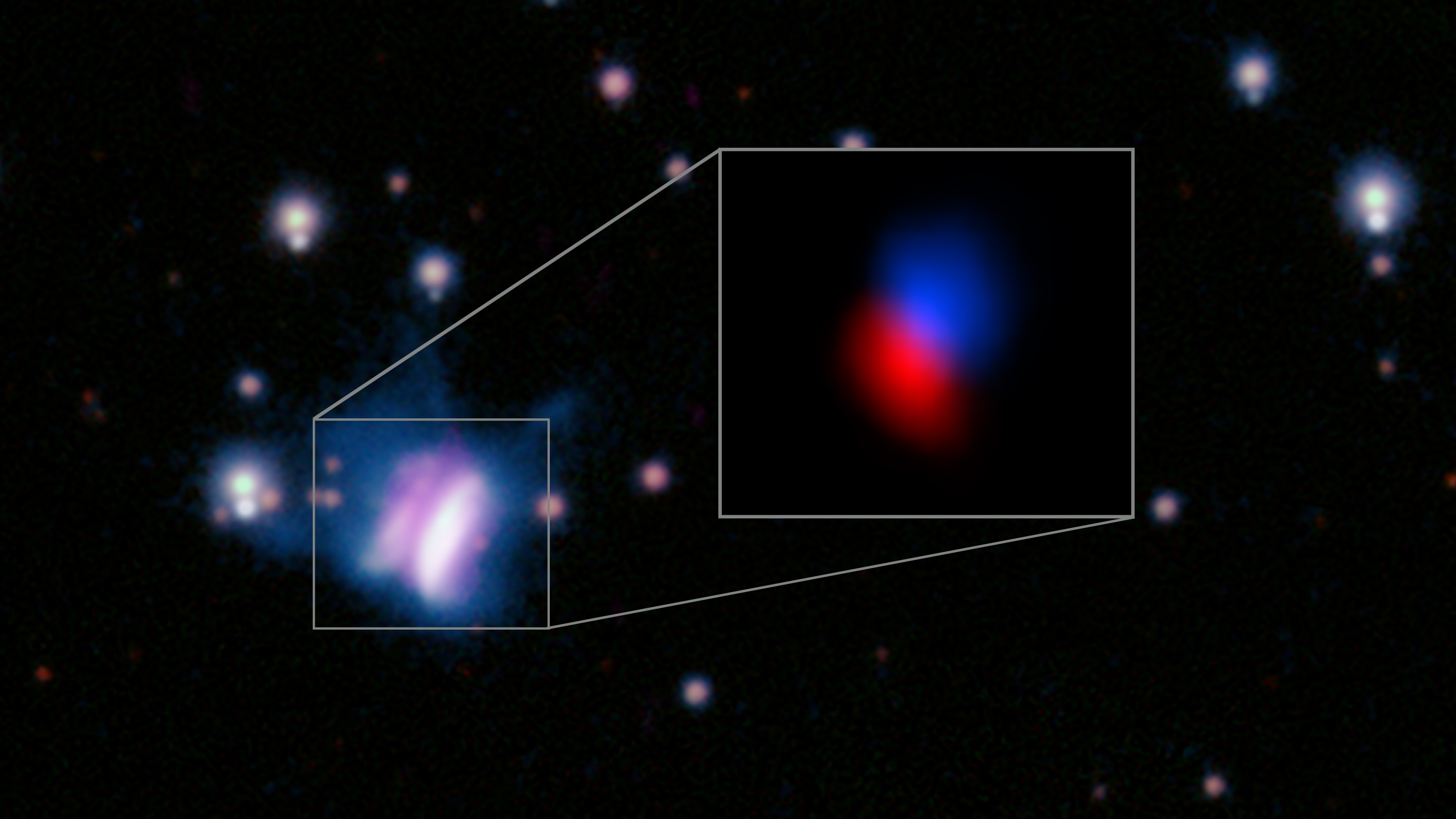 The inset for this image shows compelling evidence that IRAS 23077 contains a planet-forming disk. Along with dust grains, the SMA can also observe the cold carbon monoxide gas that comprises the bulk of a planet-forming disk. By measuring its velocity structure and dividing this into "blue-shifted" and "red-shifted" components showing material moving towards us and away from us respectively, the team showed that the gas is rotating around the central star, as expected for a planet-forming disk.