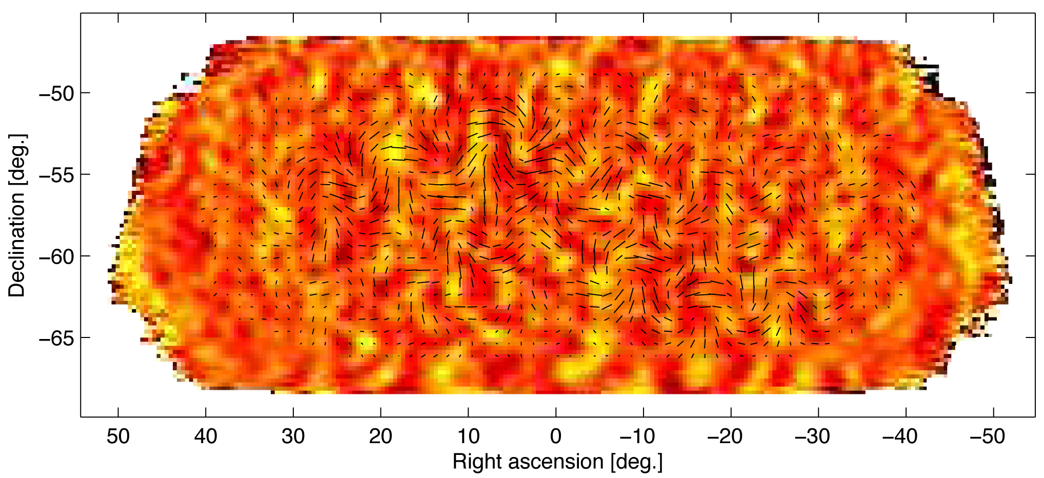 The tiny temperature fluctuations of the cosmic microwave background (shown here as color) trace primordial density fluctuations in the early universe that seed the later growth of galaxies. These fluctuations produce a pattern of polarization in the CMB that has no twisting to it. Gravitational waves from inflation are expected to produce much a fainter pattern that includes twisting ("B-mode") polarization, consistent with the B-mode polarization pattern observed by BICEP2, which is shown here as black lines. The line segments show the polarization strength and orientation at different spots on the sky. (Harvard-Smithsonian Astrophysical Observatory / BICEP2 Collaboration)
