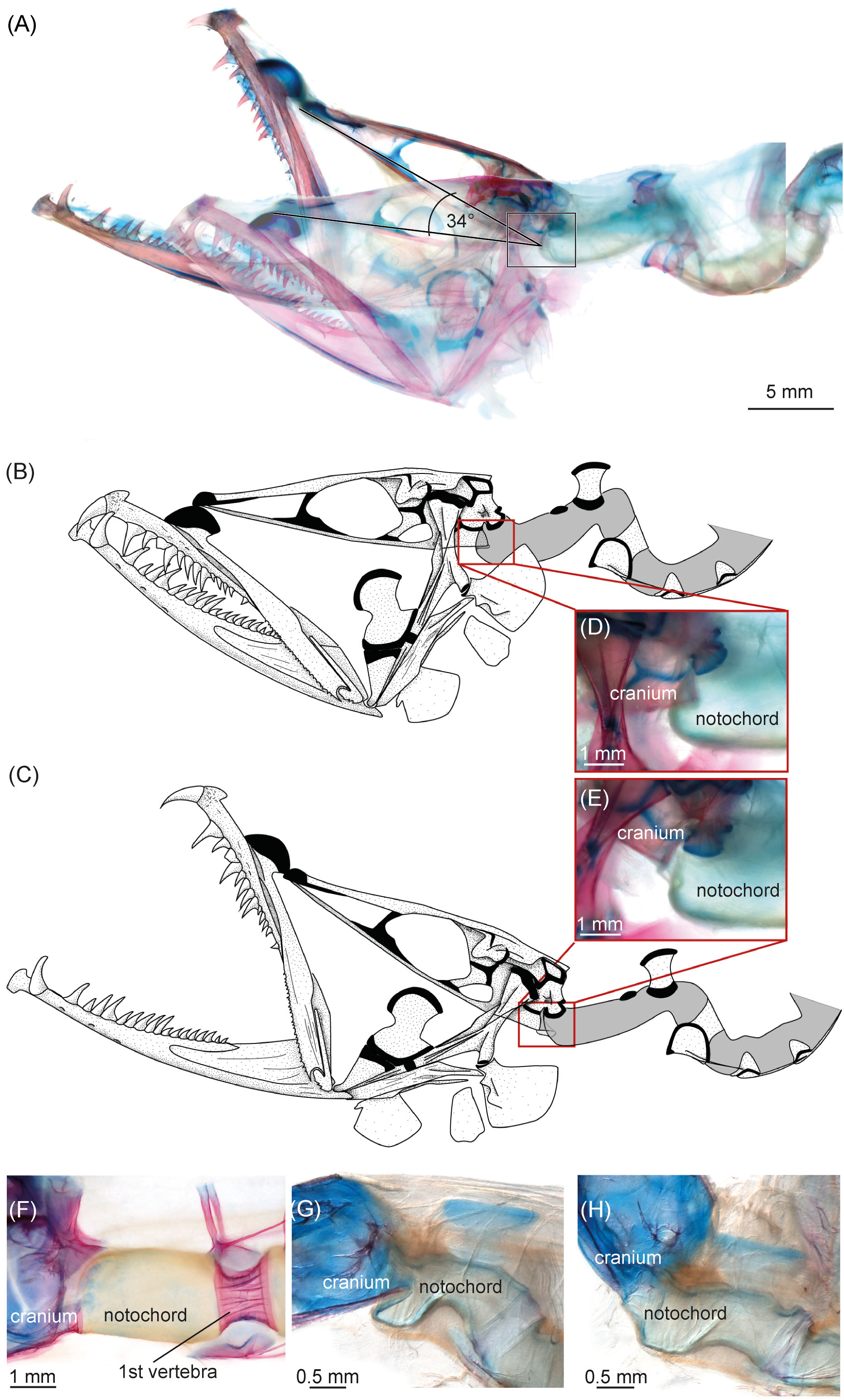 These illustrations and photos of a stained specimen show the head of a barbeled dragonfish in “resting position” (mouth closed—A, B, D, G) and as it opens its mouth completely (mouth open—A, C, E, H), showing the functional head joint (D, E). In more primitive members of the family, the flexible part of the vertebral column (notochord) forms a simple, straight connection between the head and the first ossified vertebra (F).