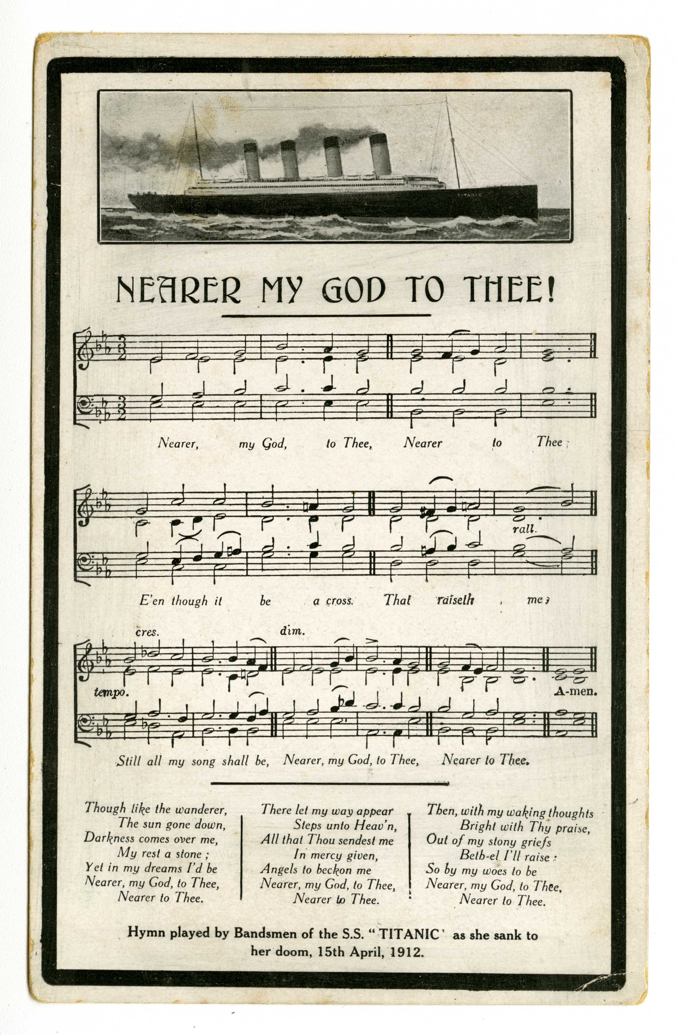 Many survivors remembered that the Titanic’s eight musicians played the hymn “Nearer My God to Thee” immediately before the ship sank. The hymn became a popular theme on Titanic memorial postcards. None of the musicians survived.