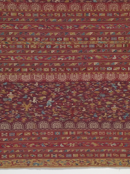 After the Spanish invasion, Inka textile patterns changed dramatically, yet the Andean people preserved much of their traditional technology and designs. This manta includes scenes of people and animals depicted in a Spanish style as well as abstract bands of tocapu (Inka symbols) that were typical of the Inka style.