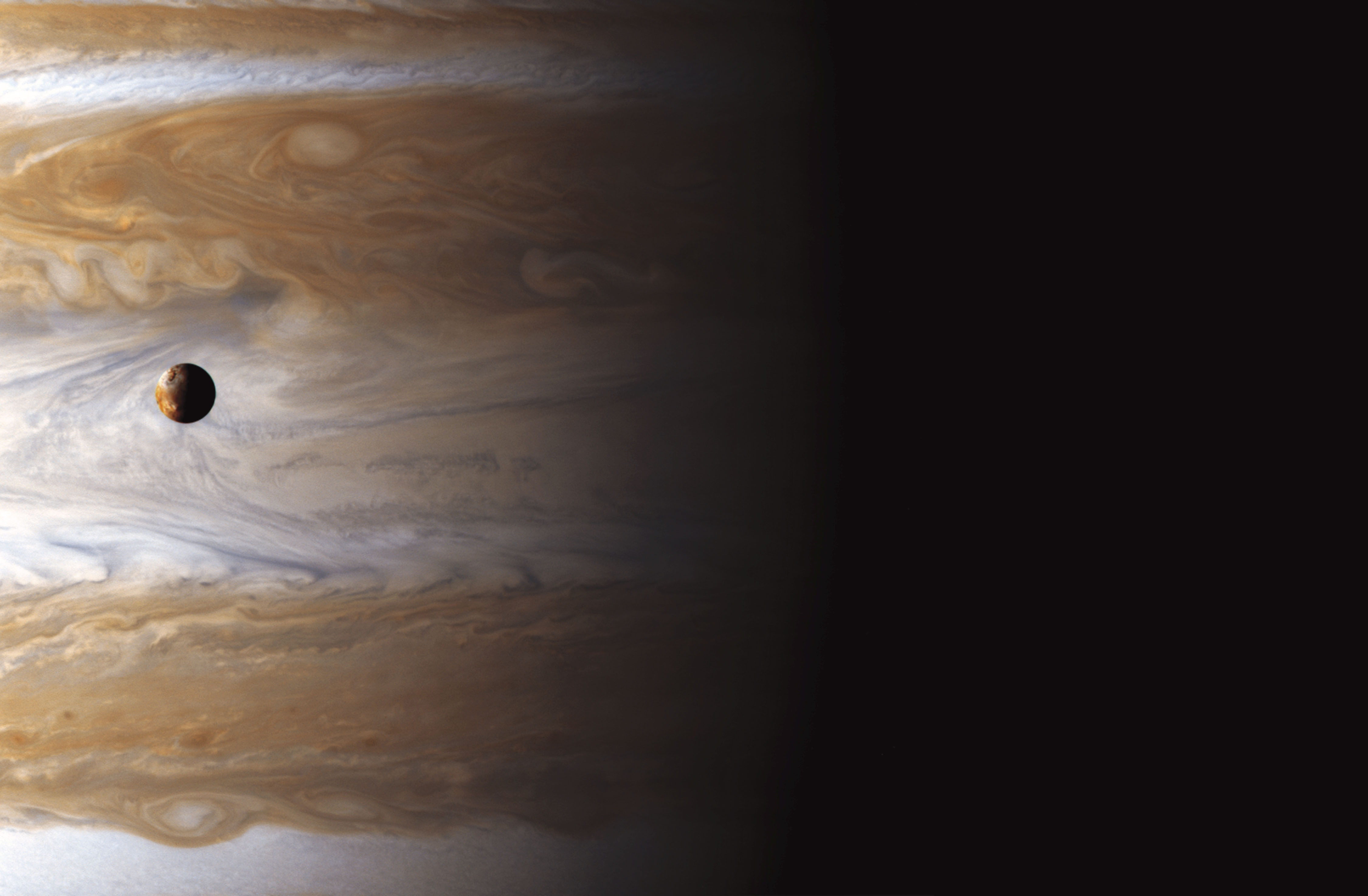 Io appears near the center in the transition area between Jupiter’s day and night sides. Even though Jupiter’s size is immense, it rotates much faster than Earth—once every 10 hours.