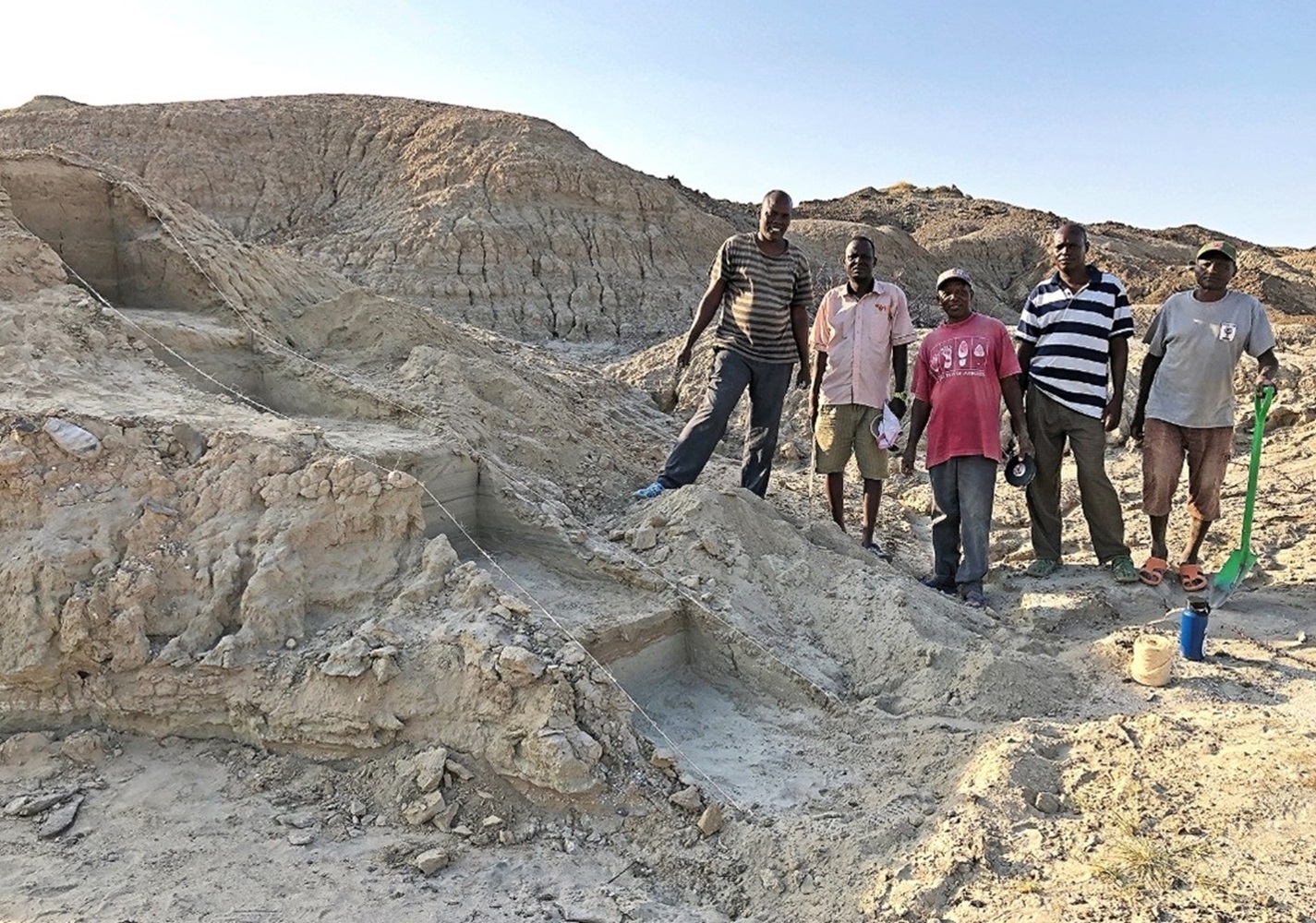 Geological trench at the footprint site that revealed multiple stratigraphic levels for future research. Kenyan excavators (left to right) Apolo Alkoro Longaye, Hilary Sale, Ben Sila, Losogo Nyakitala and David Kipkebut provided assistance with Behrensmeyer’s geological work on the site in 2023. Note: Photo included with permission of all who are pictured.
