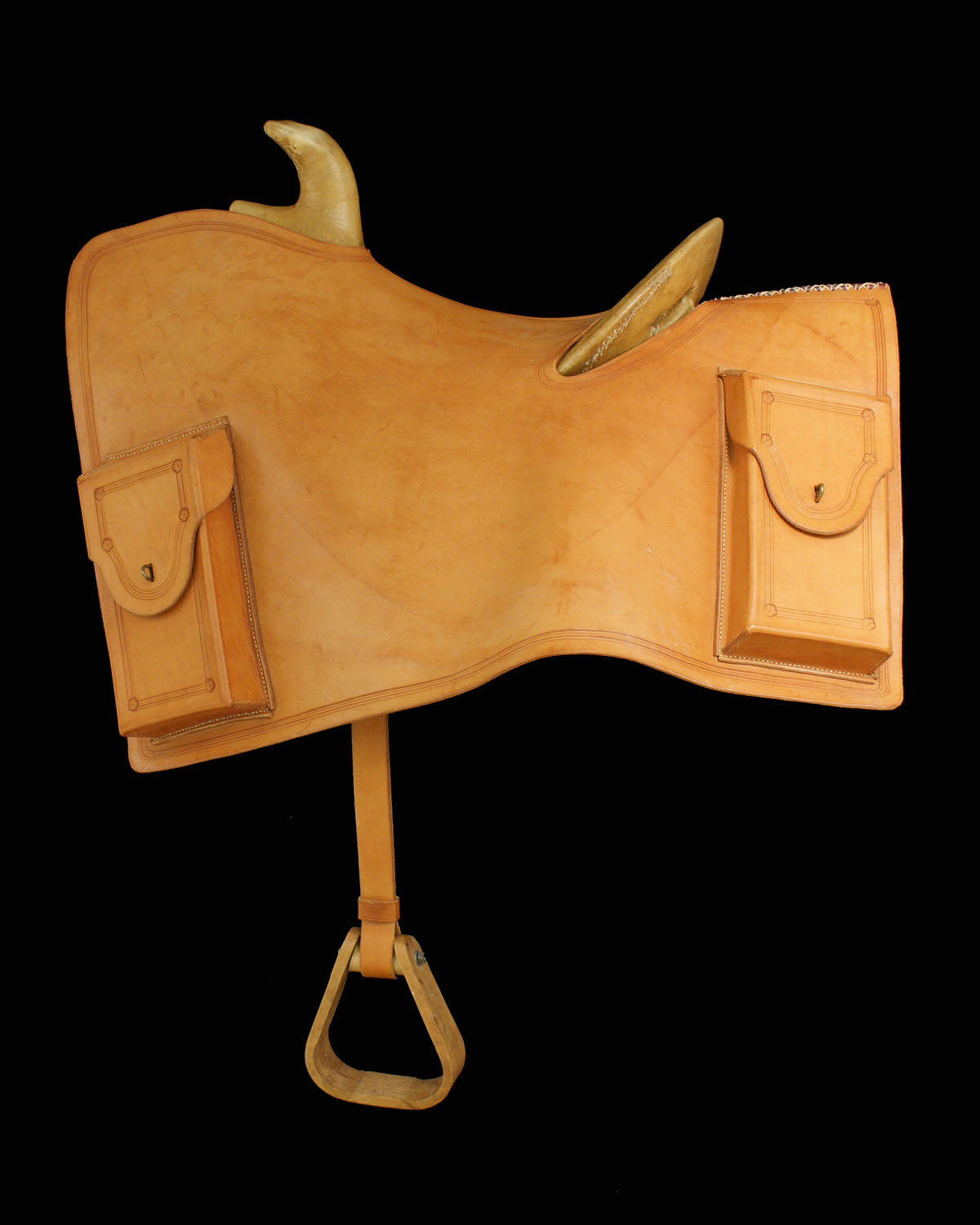 Replica of a Pony Express mochila – the leather covering that fitted over riders’ saddles. The mochila had four pockets to carry the mail.