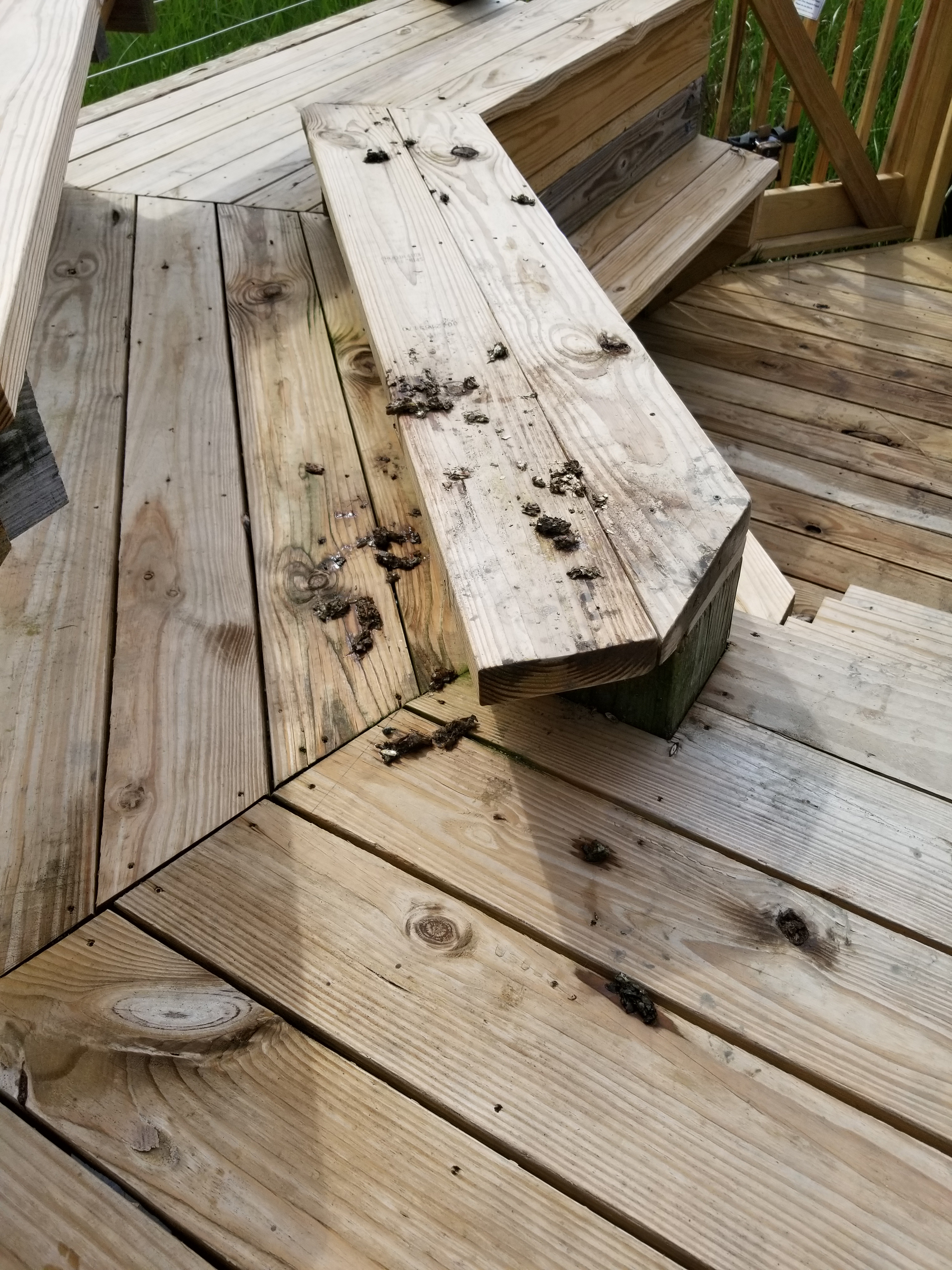 Closeup of otter scat on a wooden marsh overlook at the Smithsonian Environmental Research Center. (Credit: Calli Wise, Smithsonian Environmental Research Center)