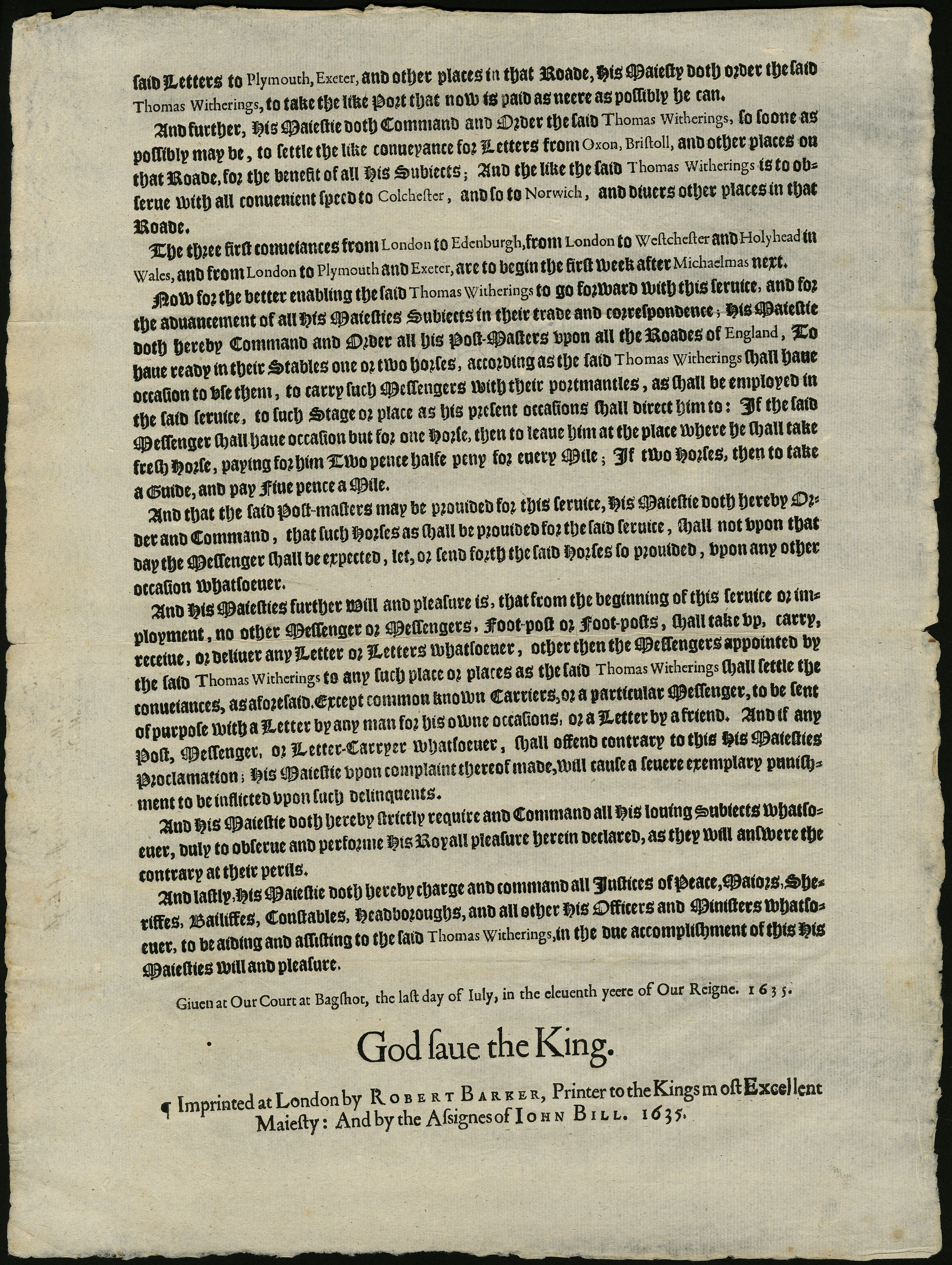 Page two of a two-page folio imprinted at London by Robert Barker, printer to the King’s most Excellent Majesty, and by the assignes of John Bill, 1635.