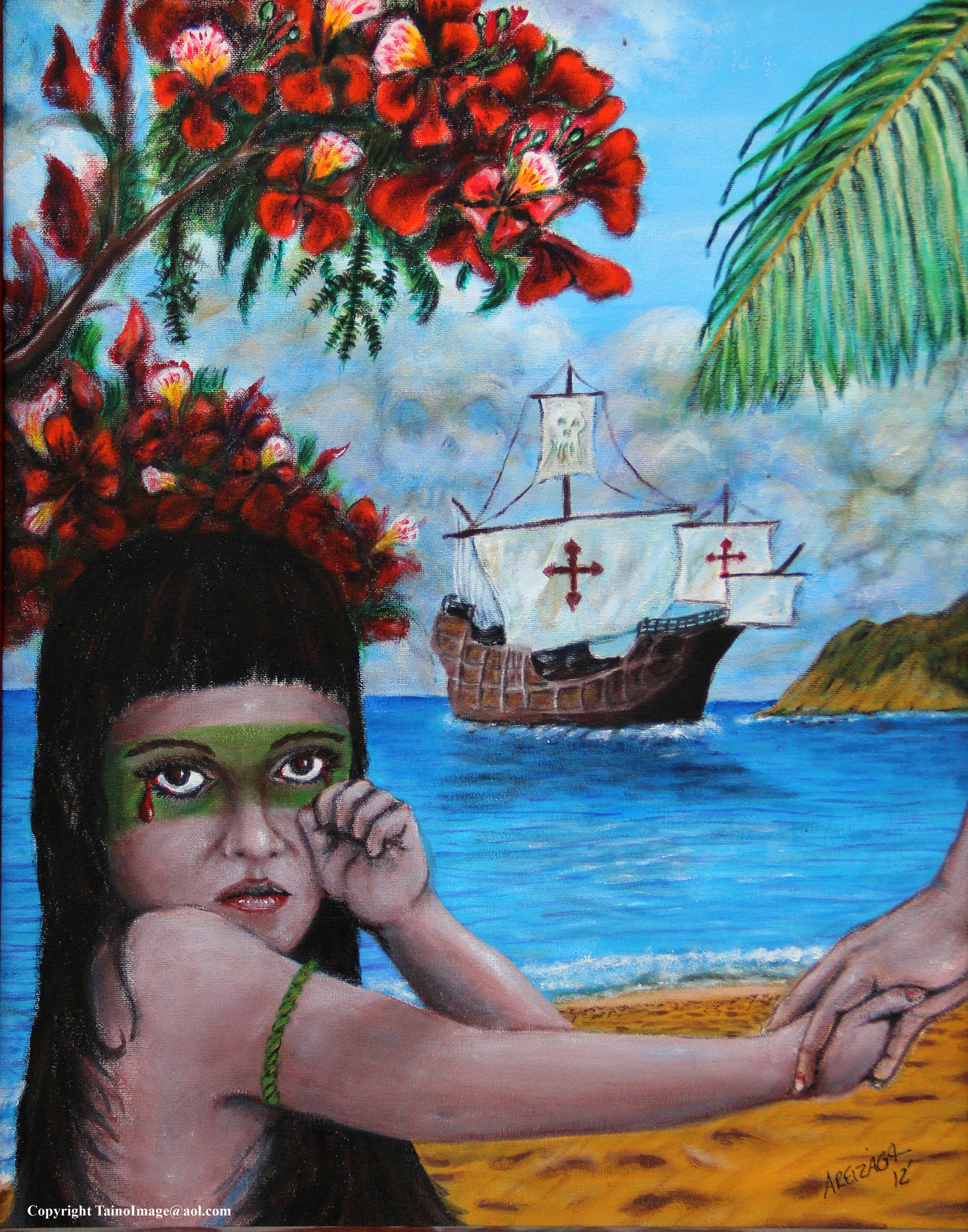 A painting from contemporary Taíno artist Albert Areizaga showcases the destruction that European colonization brought to the Caribbean.