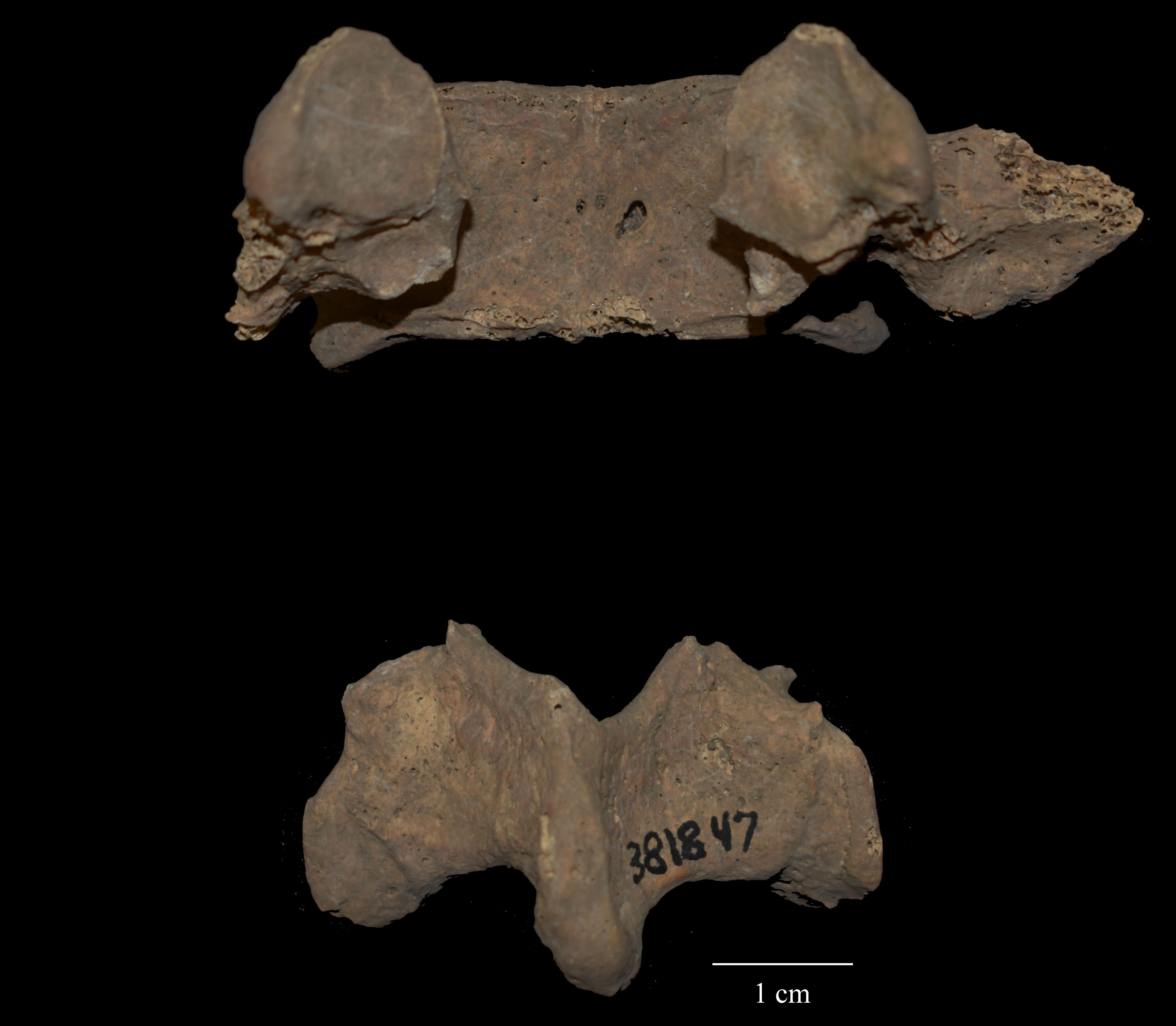 A separation of the posterior part of the fifth lumbar vertebra has healed into a false joint (pseudarthrosis). In this case, Harvard archaeologist, Samuel K. Lothrop interpreted the skeleton as having a broken back, but other than the spondylolysis of this vertebra, the rest of the spine showed no evidence of injuries that took place during the individual’s life or around their time of death.