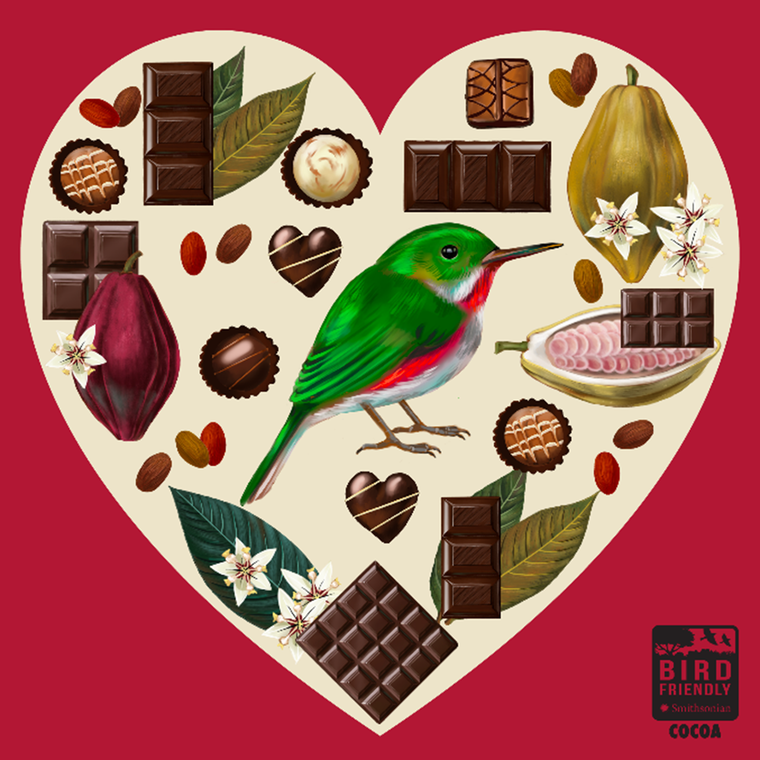 Eating chocolate is now better for birds, humans and the planet. The Smithsonian’s National Zoo and Conservation Biology Institute (NZCBI) has expanded its Smithsonian Bird Friendly certification program to include standards for cocoa farming. This is the only certification that guarantees 100% of the cocoa produced comes from farms that conserve birds and other wildlife by protecting forests and native shade trees. Drinking and eating Bird Friendly products is one of “seven simple actions to live Bird Friendly.” This year, people can make their Valentine’s hearts soar with Smithsonian Bird Friendly-certified chocolate, now available for purchase.