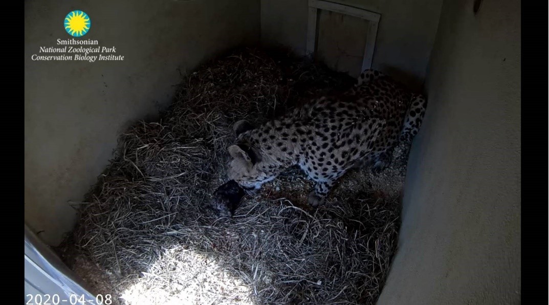 Carnivore keepers at the Smithsonian Conservation Biology Institute (SCBI) in Front Royal, Virginia, are about to welcome a litter of chirping cheetah cubs. Five-year-old female Echo is having contractions and birthed one cub already shortly after 11 a.m., which can be viewed via the Cheetah Cam. They were sired by 4-year-old Scott. Animal care staff will leave Echo to bond with and care for her cubs without interference, so it may be some time before they can determine the cubs’ sexes.