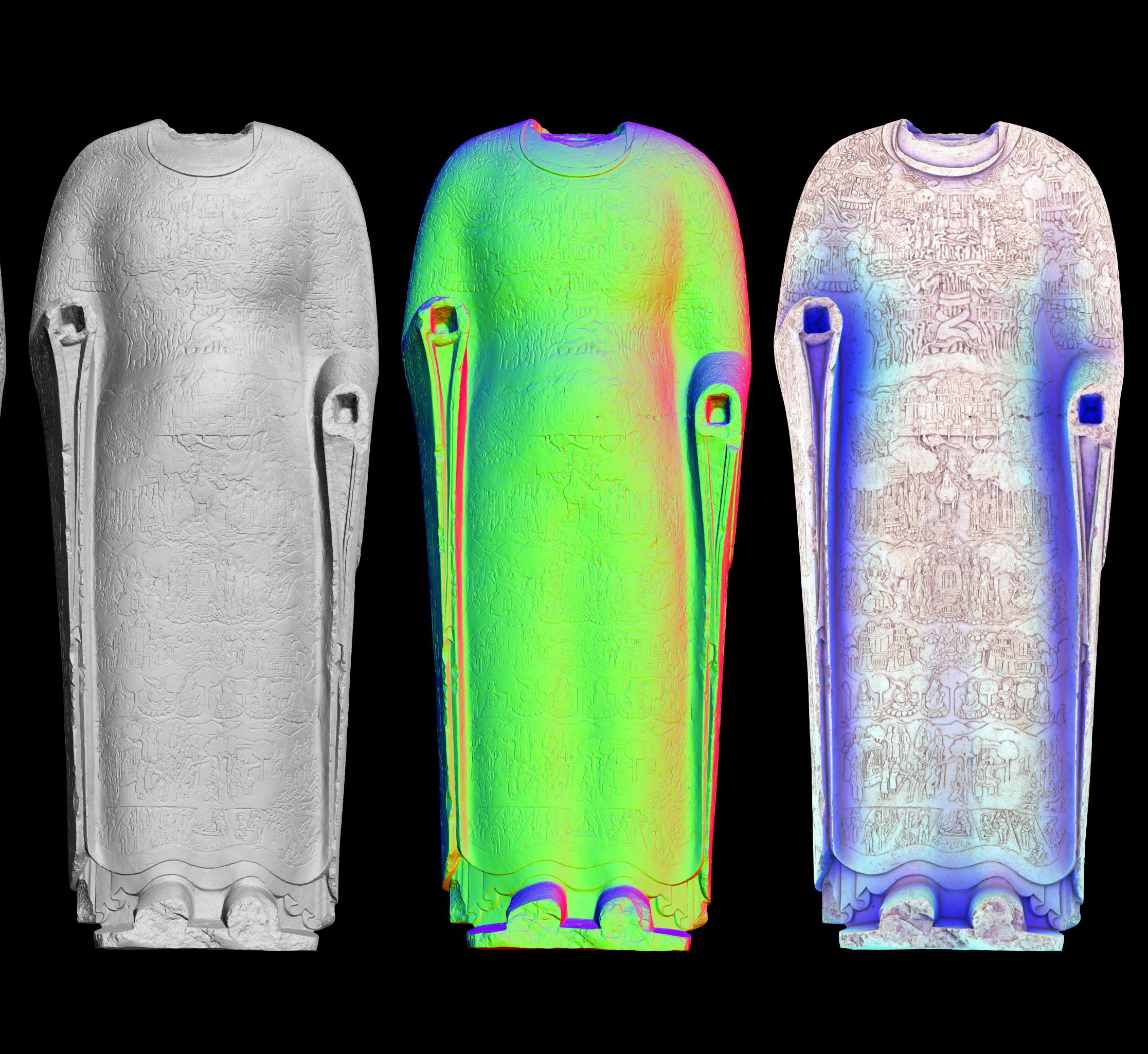 Now, 3-D scanning, along with a wide variety of digital tools, can be used to clarify the sculpture’s designs. Using a laser-arm scanner, the ancient work was scanned and its color recorded through more than 300 photographs of the work. The combined surface and color data creates a 3-D model made of 20 million triangles.