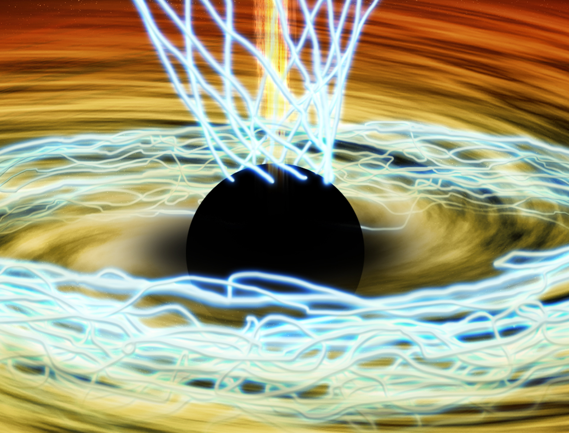 Sgr A* is surrounded by an accretion disk of material orbiting the black hole. The team found that magnetic fields in some regions near the black hole are disorderly, with jumbled loops and whorls resembling intertwined spaghetti. In contrast, other regions showed a much more organized pattern, possibly in the region where jets would be generated.