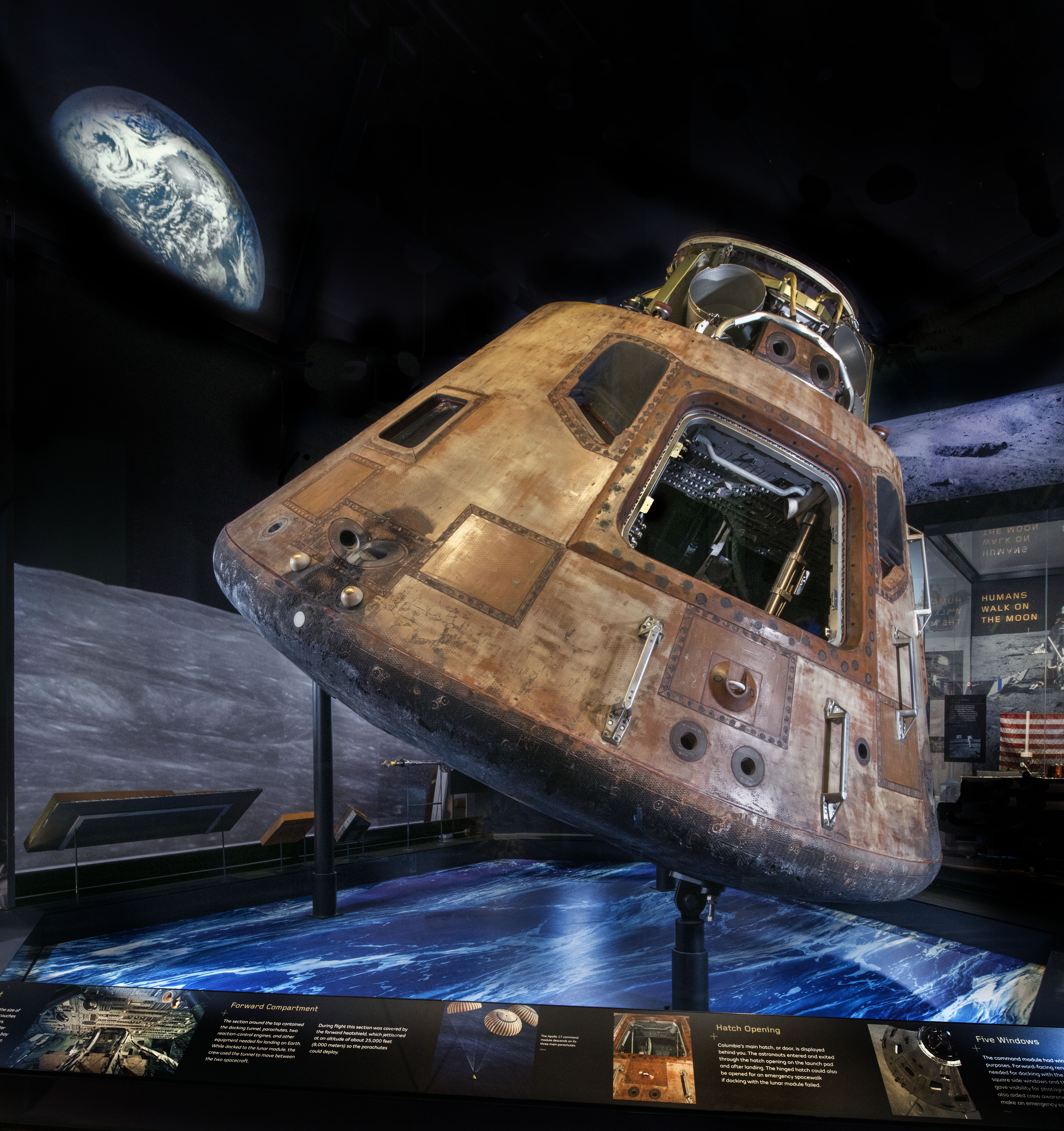 The Apollo 11 Command Module Columbia displayed in the new "Destination Moon" exhibition, opening Oct. 14, 2022. Credit: Smithsonian's National Air and Space Museum