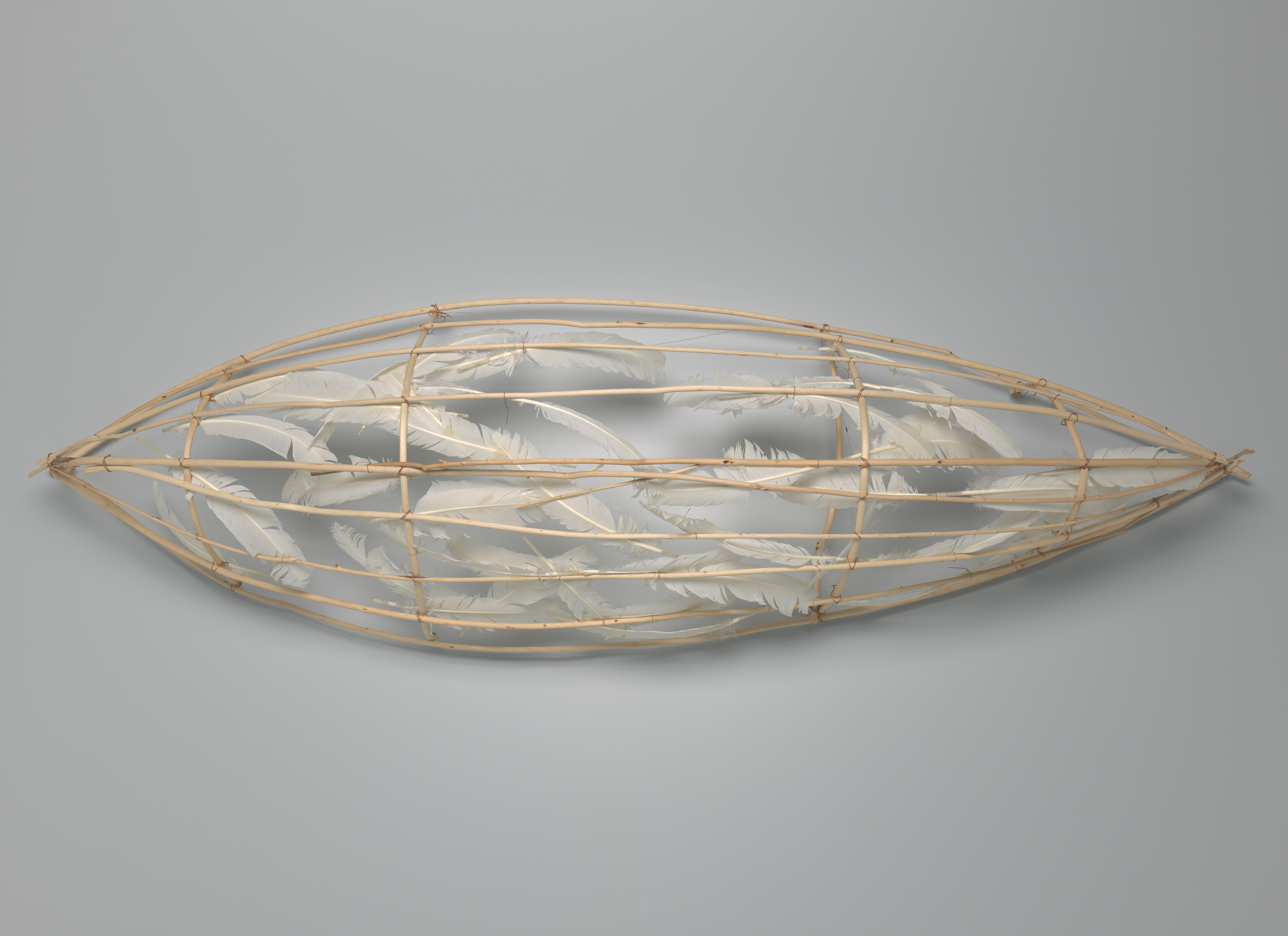 Truman Lowe (Ho-Chunk, 1944–2019), Feather Canoe, ca. 1993. Peeled willow saplings, feathers, copper wire, 22 x 74 x 12 in. National Museum of the American Indian 41/6541