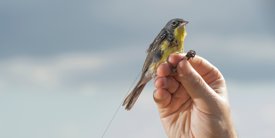Research ecologist Nathan Cooper holds a radio-tagged Kirtland’s Warbler just before releasing it in The Bahamas. Credit: Tim Romano/Smithsonian