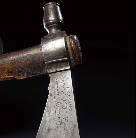 A ceremonial pipe-tomahawk presented to Chief Tecumseh (Shawnee, 1768-1813) by British commander Col. Henry Proctor, during the War of 1812.