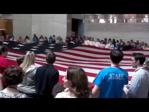 The flag was then displayed in a glass case in the Smithsonian’s Arts and Industries Building. It remained on view there for nearly 50 years, except for two years during World War II, during which time it was housed in a government warehouse in Virginia, to be protected from possible bombing raids on the nation’s capital. In 1964 the flag was moved to the new National Museum of History and Technology (now the National Museum of American History), where it was displayed in the central hall on the second floor.