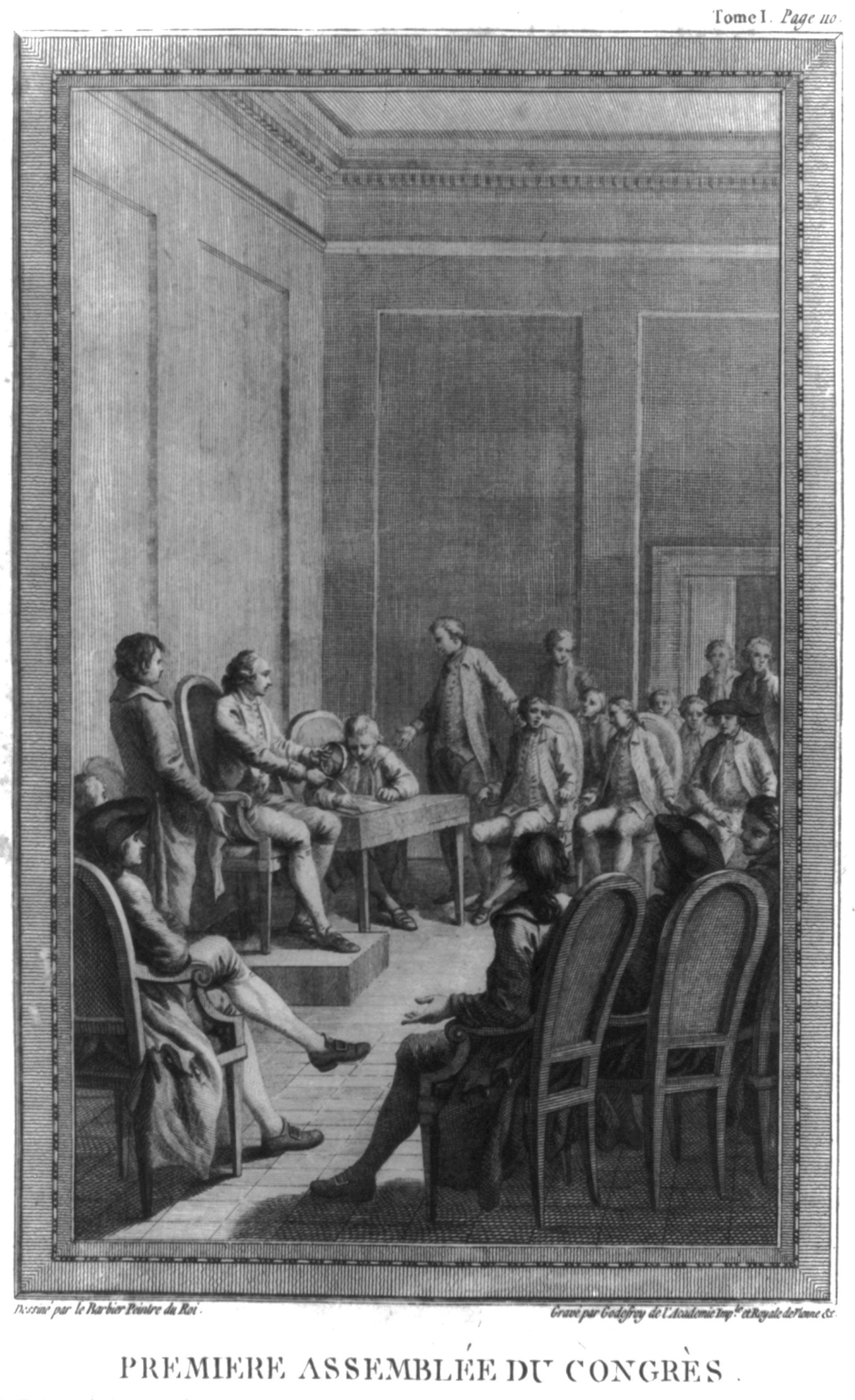 A 1782 engraving depicts the First Continental Congress, held in 1774. François Godefroy engraving from Library of Congress