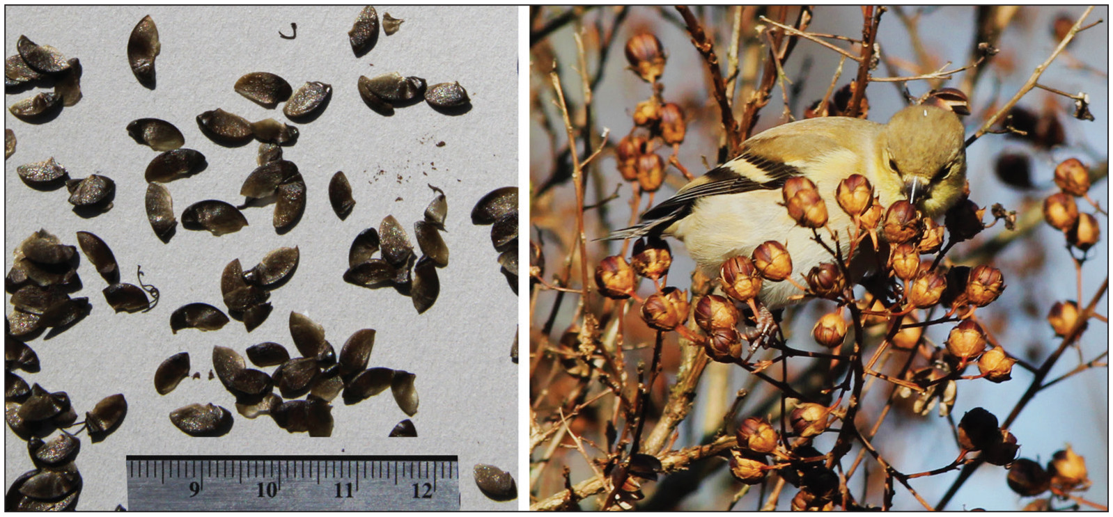 Left, the winged seeds of crape myrtle; and right, an American goldfinch feeding on crape myrtle seed. (Image courtesy Gary Graves)