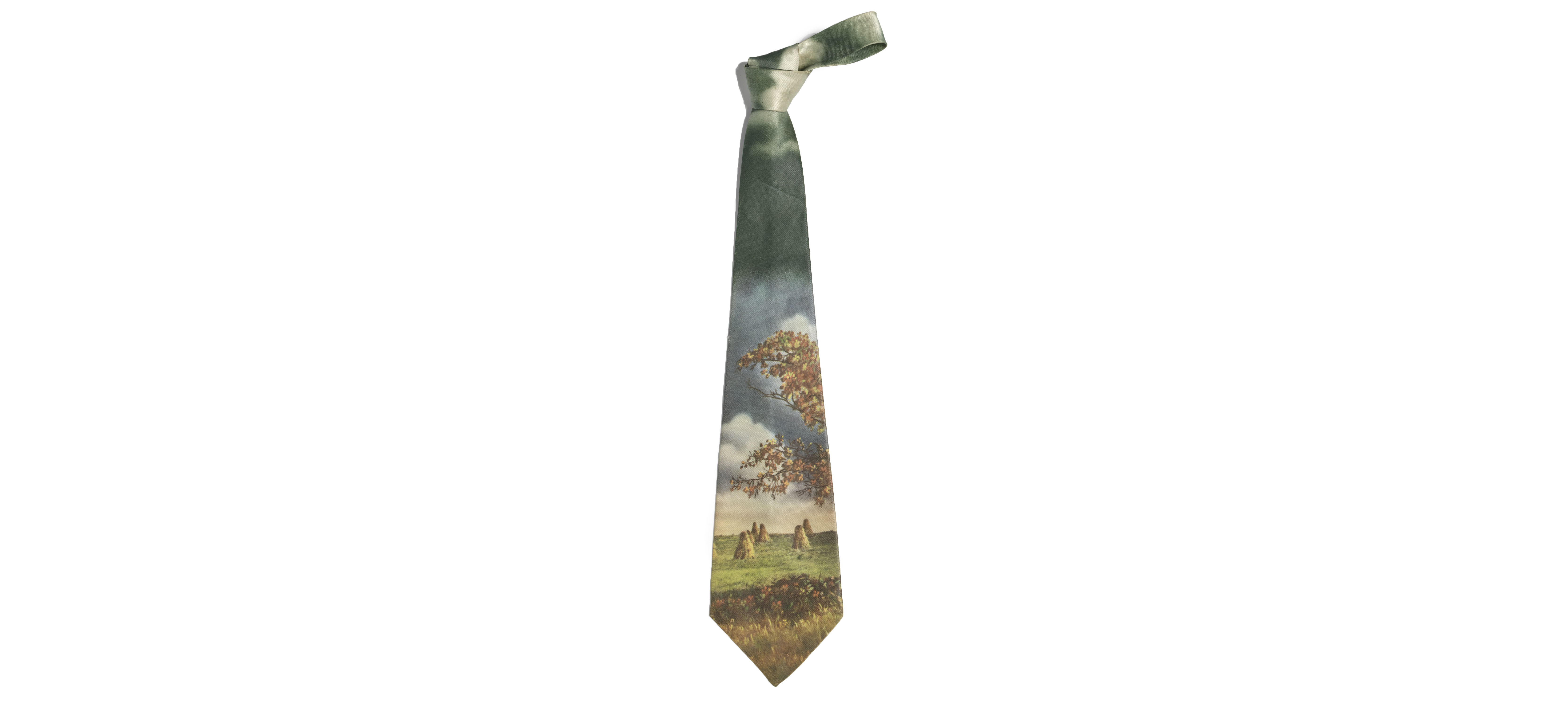 This tie—made by Metcalf Neckwear Company—belonged to gospel singer Ira Tucker Sr., who wore it around 1950. Tucker was the lead singer for the Dixie Hummingbirds for around 70 years.