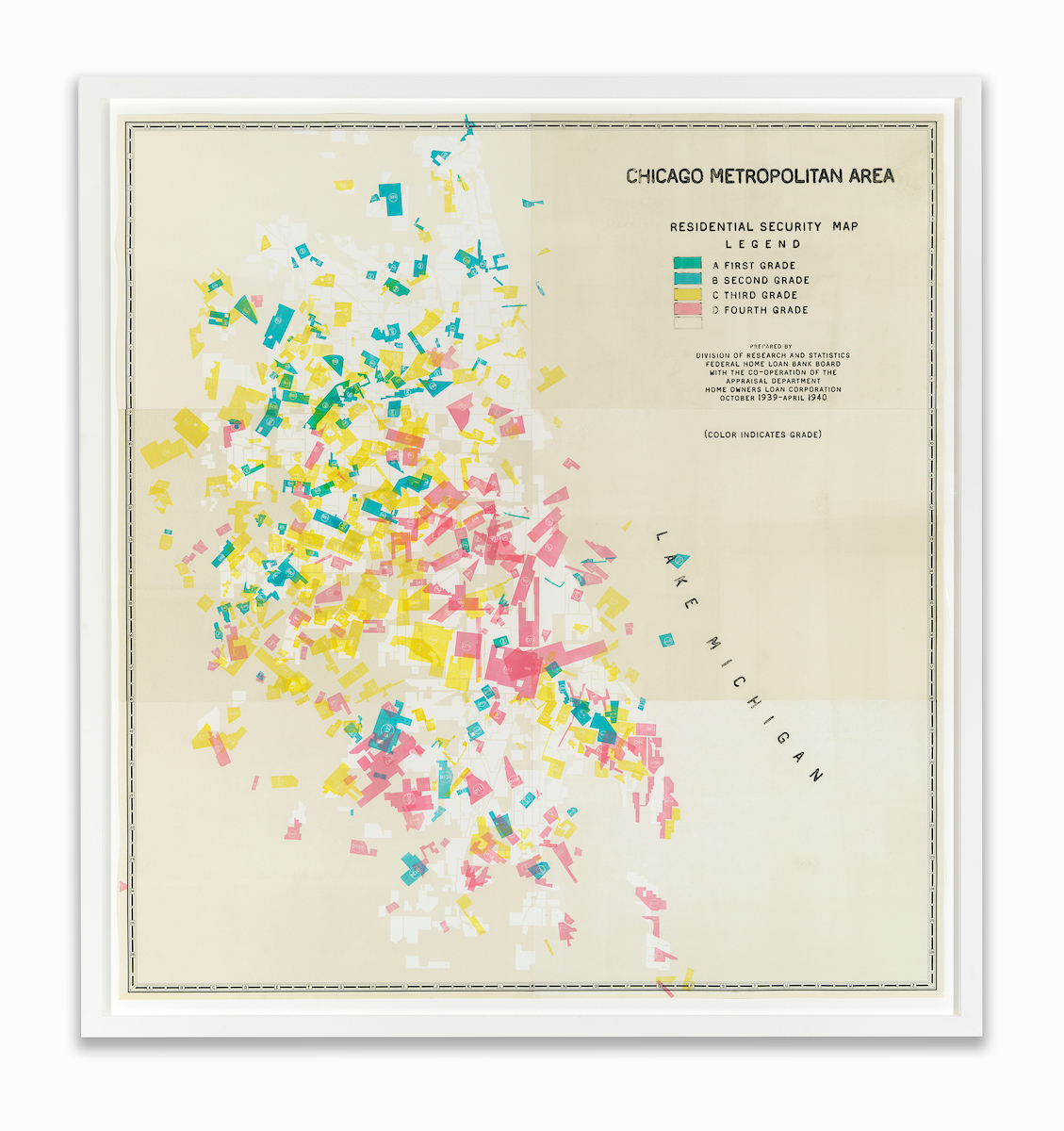 Chicago’s neighborhoods are shaken up in this artwork by Amanda Williams. “Cadastral Shaking (Chicago v1)” reenvisions 1930s maps created by the Federal Housing Administration that were color-coded to differentiate neighborhoods where it was considered safer and more desirable to insure mortgages.
