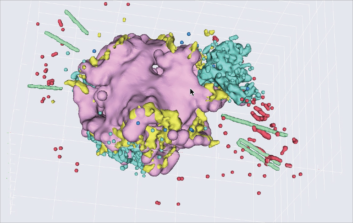 Screen shot of the VR model being built. Colors assigned include jets in green; iron in blue; neon in yellow; cooler debris in purple; outer blast wave in red.